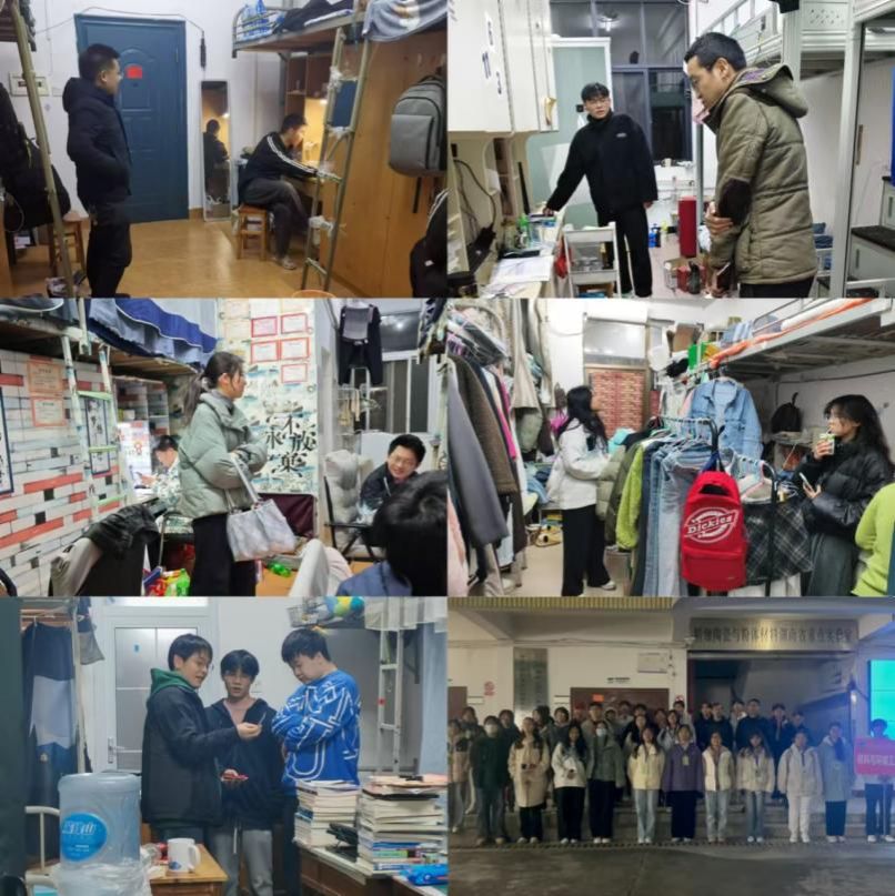 在考研冲刺的关键阶段,为深入了解大四学生的考研准备情况,加强宿舍安全管理,营造良好的学习与生活氛围,2024年12月18日晚九点三十分,由材料与环境工程学院副院长彭伟才带领的辅导员和班主任们深入学生宿舍,开展了一次温暖而细致的走访活动,为同学们送去关怀与支持。