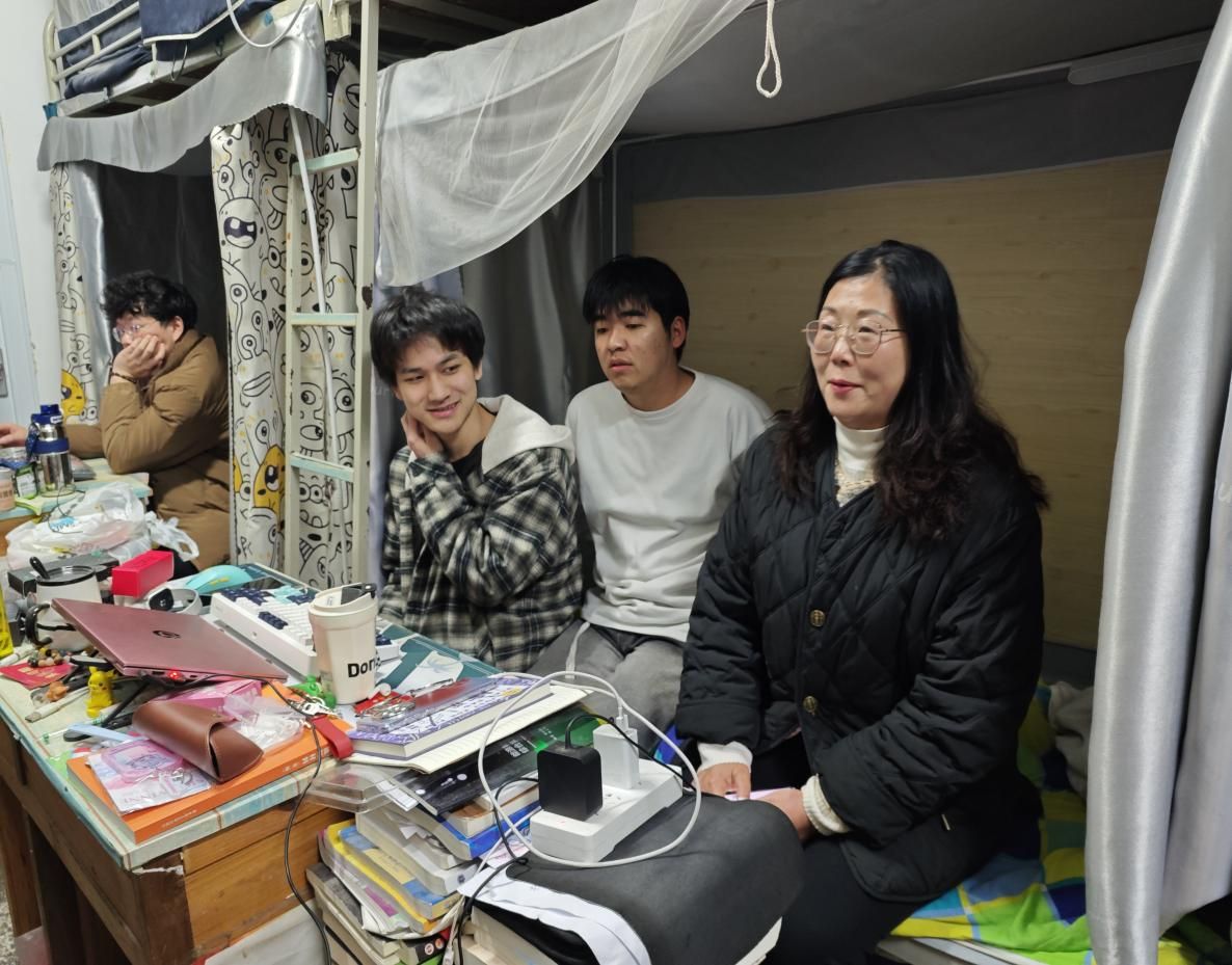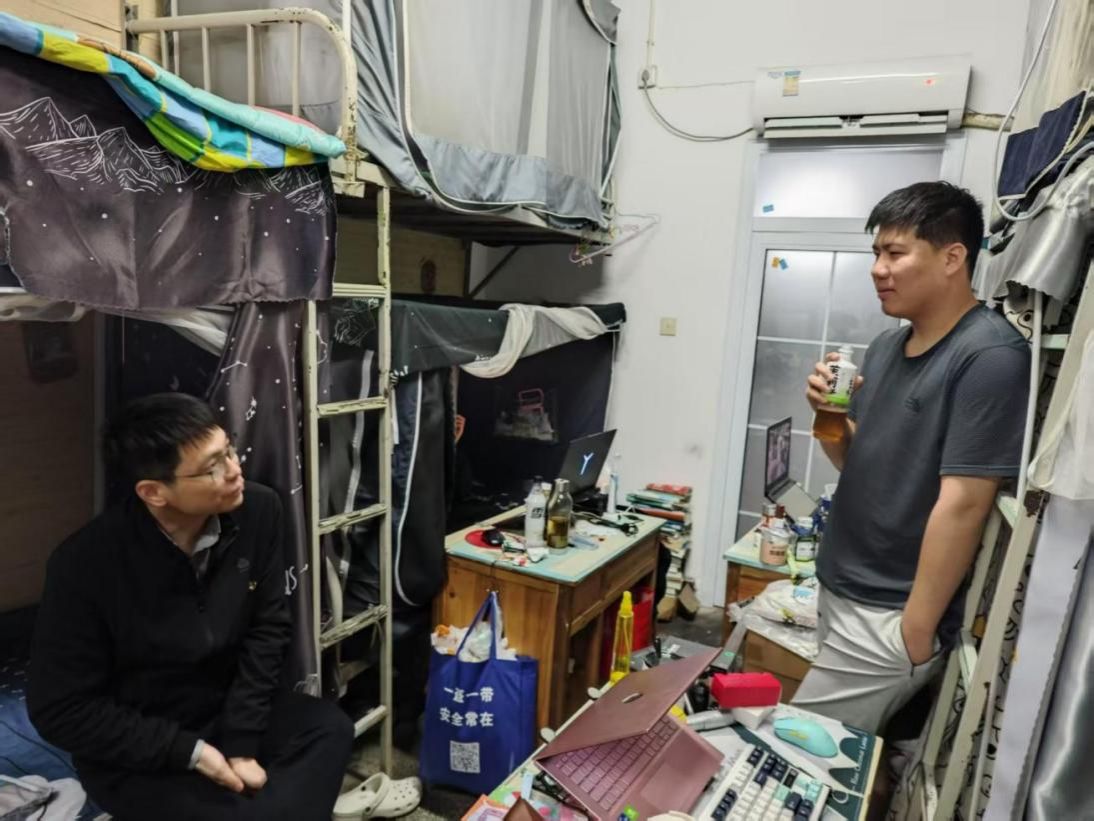 校领导一行首先来到男生宿舍。推开门时,几位同学正在讨论课程作业。谭校长微笑着询问了同学们的专业学习情况,并亲切地介绍了自己了解的实习岗位,耐心分析了今年的就业形势,尽力为学生提供帮助,减轻他们的思想负担,鼓励他们对未来充满希望。