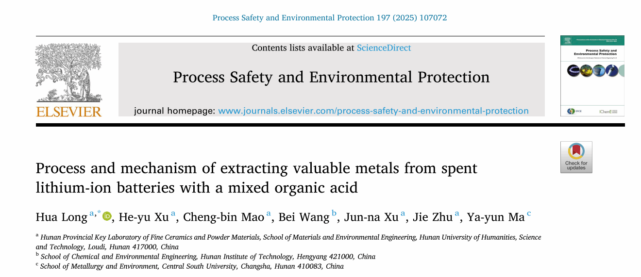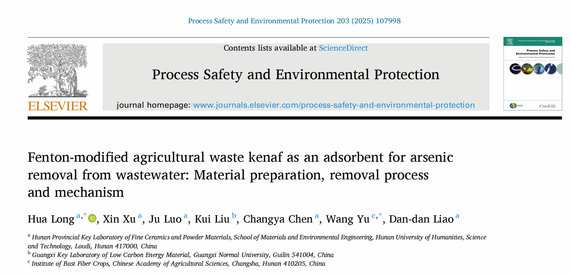 近日,材料与环境工程学院龙华博士团队在环境科学与生态学领域国际Top期刊《Process Safety and Environmental Protection》先后发表两篇重要研究论文,题目分别为“Process and mechanism of extracting valuable metals from spent lithium-ion batteries with a mixed organic acid”和“Fenton-modified agricultural waste kenaf as an adsorbent for arsenic removal from wastewater: Material preparation, removal process and mechanism”。KY开元集团官网入口均为论文的第一完成单位。