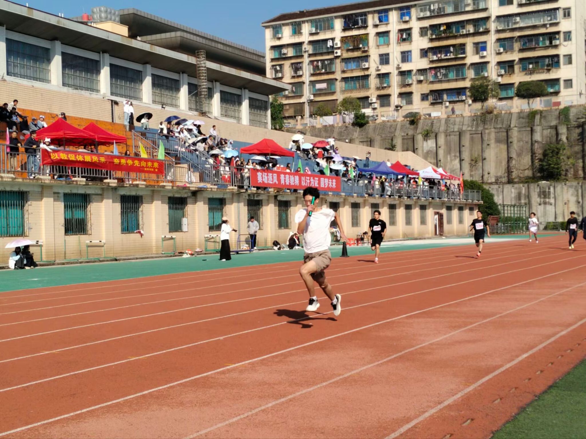 男子4×100米接力决赛燃爆全场!材环院四位健儿蓄势待发、神情专注,发令枪响后如旋风般奔出。起跑迅猛、弯道稳健、直道提速,每一次接力棒传递都精准流畅,凝聚着无数次训练的默契。面对强手冲击,他们全力以赴、奋勇争先,凭借强劲实力与团队协作一路突围,最终斩获第二名。用拼搏诠释体育精神,尽显材环学子的凝聚力与昂扬风采!