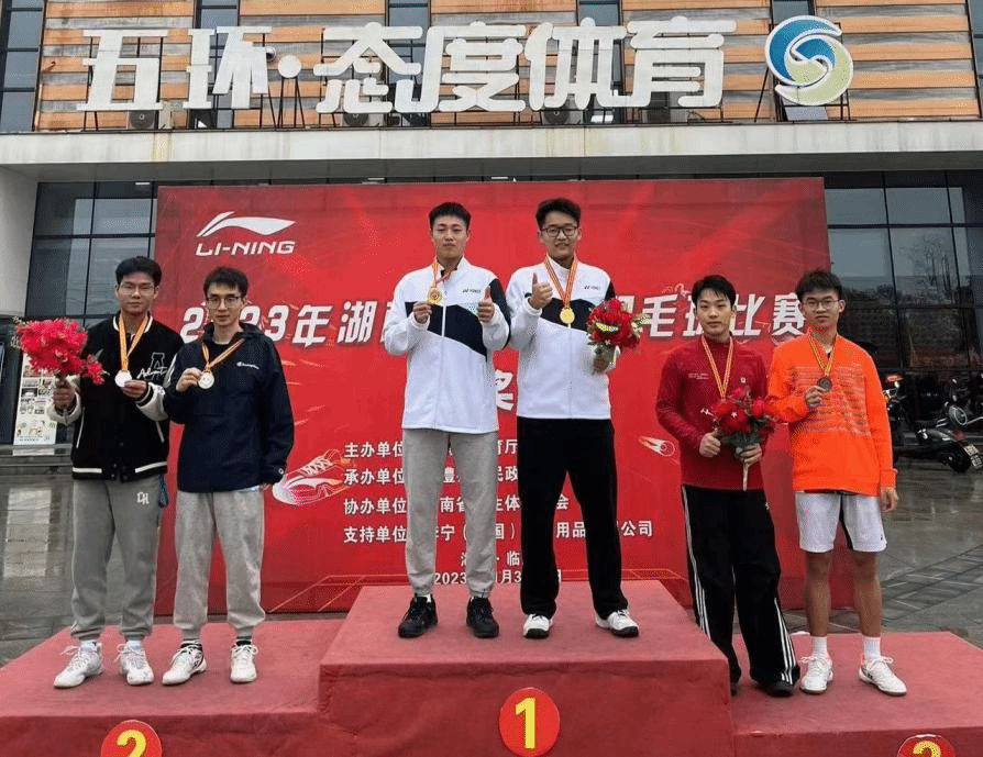 此次比赛有来自湖南省的近百支队伍参与,竞争激烈,李英圻同学,经过数月的备战和紧张的角逐,最终获得2023年湖南省大学生羽毛球赛甲组男子双打冠军,这离不开李英圻同学的辛勤付出和教练专业的战略部署。
