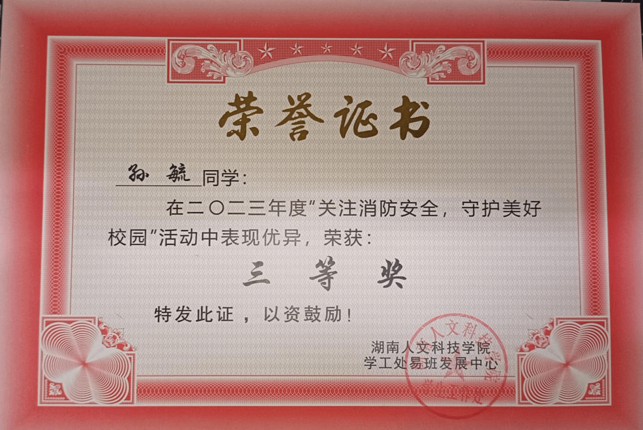 2023年11月9号是第32个全国消防日,为压实消防安全主体责任,提高同学消防安全意识,筑牢消防安全防线,材料与环境工程学院易班于11月6号到11月25号在线上展开了二〇二三年度“关注消防安全,守护美好校园”系列活动。其中,2023级环境工程一班孙毓同学在活动中表现优异,答题表现优秀,荣获三等奖。