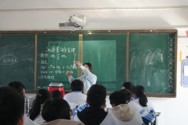 课上,罗思思同学围绕《质量守恒定律》展开课程讲解,通过直观清晰的化学实验,向同学们简单介绍了质量守恒定律的基本概念。同时,实习队成员还结合先前课程所学到的两个氢原子和一个氧原子成比例构成水分子的知识点,再次例证了质量守恒定律。最后,结合对相关例题的讨论回答,加深了同学们对质量守恒定律的理解。