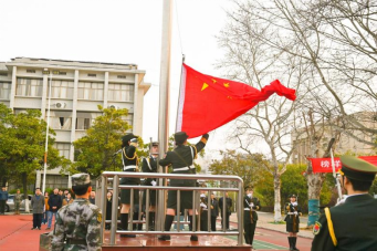 升旗进行时,伴随着激昂的《义勇军进行曲》,鲜艳的五星红旗在蓝天白云的映衬下冉冉升起。全体师生肃立注目、齐唱国歌,表达对祖国的热爱和祝福。