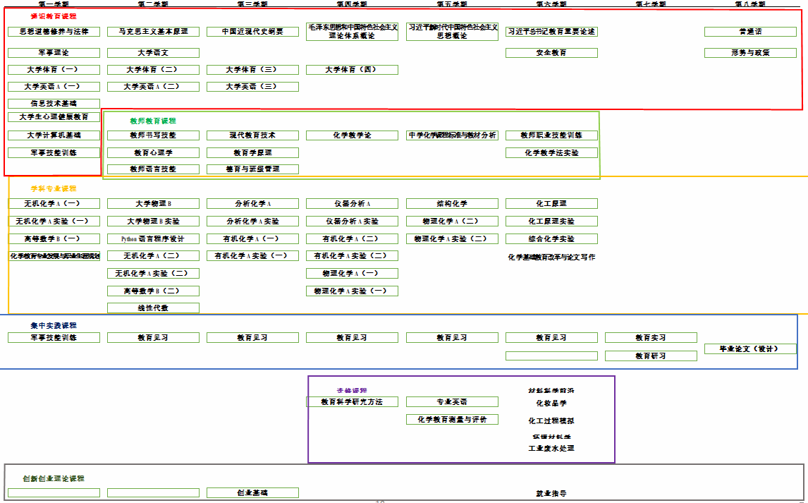 基础化学实验(无机化学、有机化学、物理化学、分析化学)、化工原理实验、化学教学法实验、综合化学实验、大学物理实验、教育见习、教育研习、教育实习、毕业论文(设计)。
