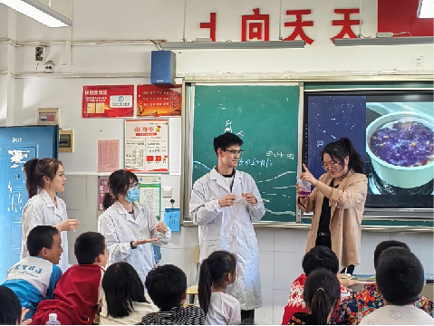 团队成员以“梦幻之旅-紫甘蓝的变色”为题,以同学们感兴趣的变色龙切入主题,选取安全有趣、易于操作的紫甘蓝作为科普“主角”。通过科普讲解,团队成员首先向同学们介绍了酸碱指示剂的概念、作用及紫甘蓝溶液的配置。随后通过实验展示为同学们展示了紫甘蓝溶液与醋、盐水、小苏打溶液混合后的颜色变化,激发学生们的好奇心与创新性。为增强活动的趣味性和体验感,科普团队带领学生们亲身实践紫甘蓝溶液与汽水、肥皂水、柠檬水混合后的实验现象,