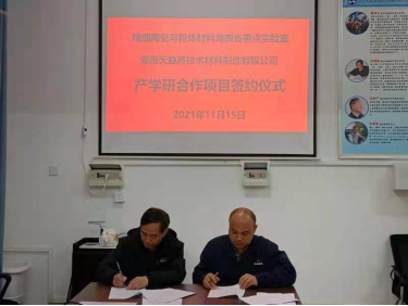 11月15日下午,精细陶瓷与粉体材料湖南省重点实验室与湖南天益高技术材料制造有限公司(以下简称“天益高科公司”)的产学研合作项目(项目名称:硬质合金辊环的高温法回收与循环利用)签署仪式在多闻楼205举行。省重点实验室主任彭秧锡、副主任陈占军,材料与环境工程学院副院长彭伟才,天益高科公司技术总监刘和平等出席签约仪式。