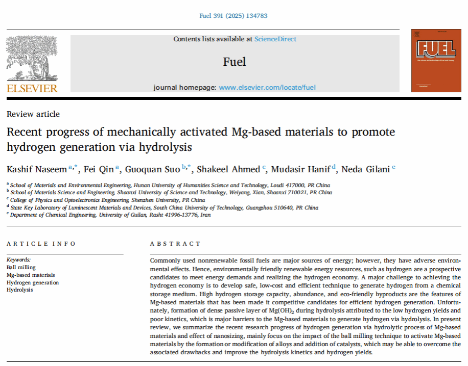 近日,材料与环境工程学院Kashif Naseem博士在工程技术领域TOP期刊《Fuel》(中科院1区,IF:6.7)发表题为“Recent progress of mechanically activated Mg-based materials to promote hydrogen generation via hydrolysis”的综述论文。KY开元集团官网入口为该论文的第一完成单位,Kashif Naseem博士为该论文的第一作者与共同通讯作者,华南理工大学发光材料与器件全国重点实验室参与了本研究。