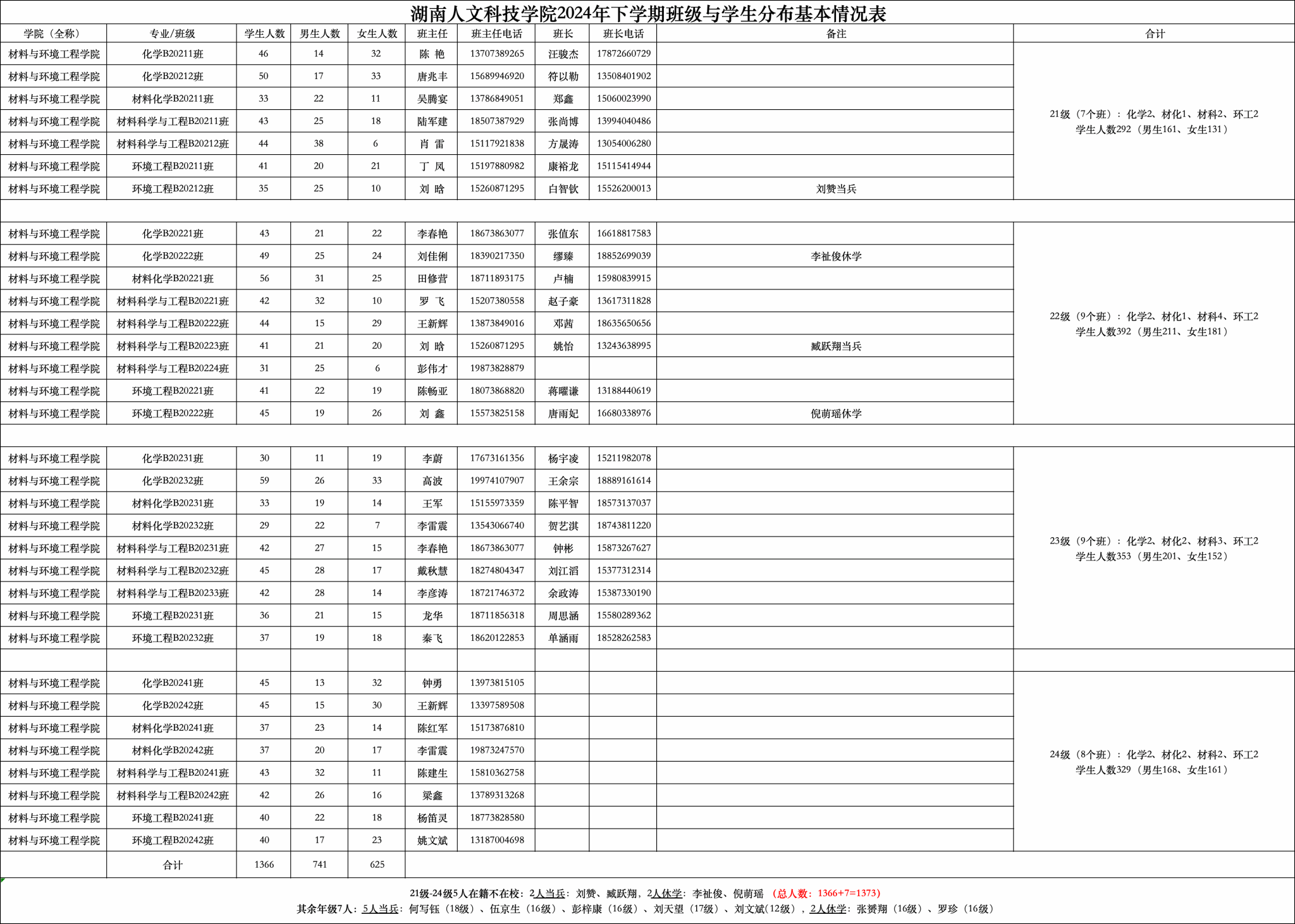 班主任与学生人数分布表(2021级-2024级)