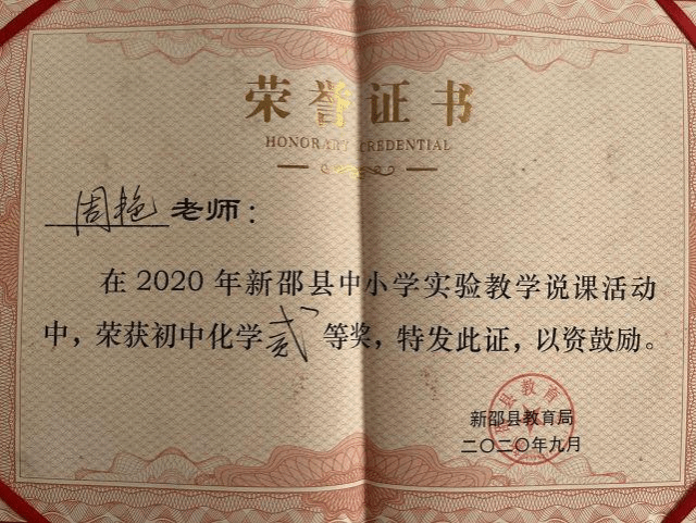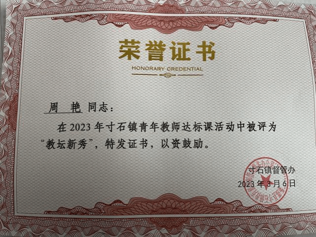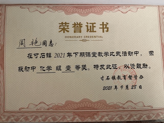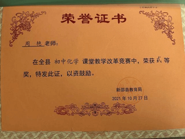 周艳,2020年毕业于KY开元集团官网入口材料与环境工程学院化学专业;2023年获评寸石镇“教坛新秀”;寸石镇2021-2022学年优秀教师;寸石镇2021年下学期教学比武一等奖,新邵县2021年初中化学课堂教学改革竞赛二等奖;2020年新邵县中小学实验教学说课初中化学二等奖。