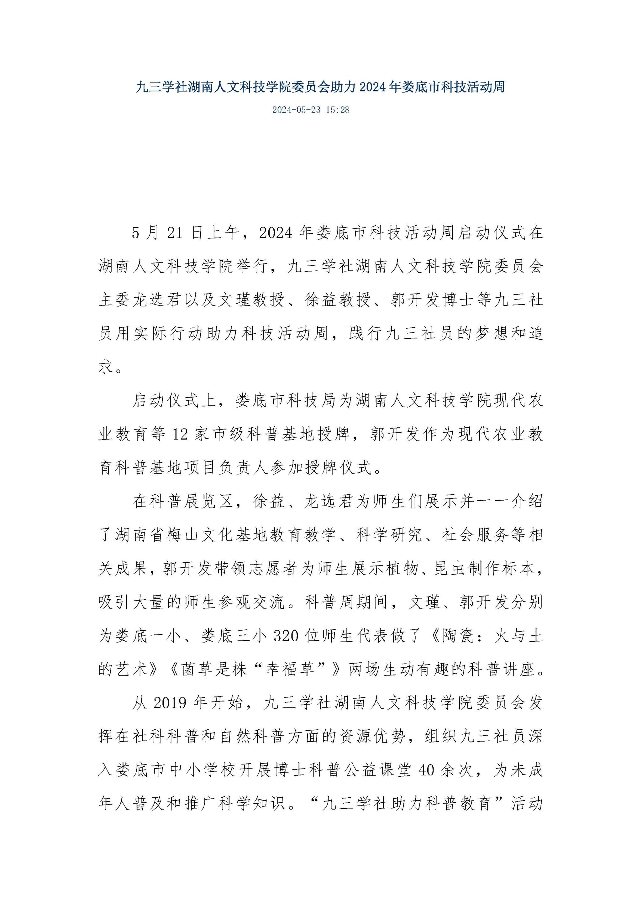 九三学社KY开元集团官网入口委员会助力2024年娄底市科技活动周