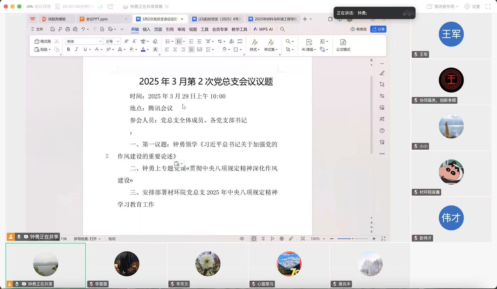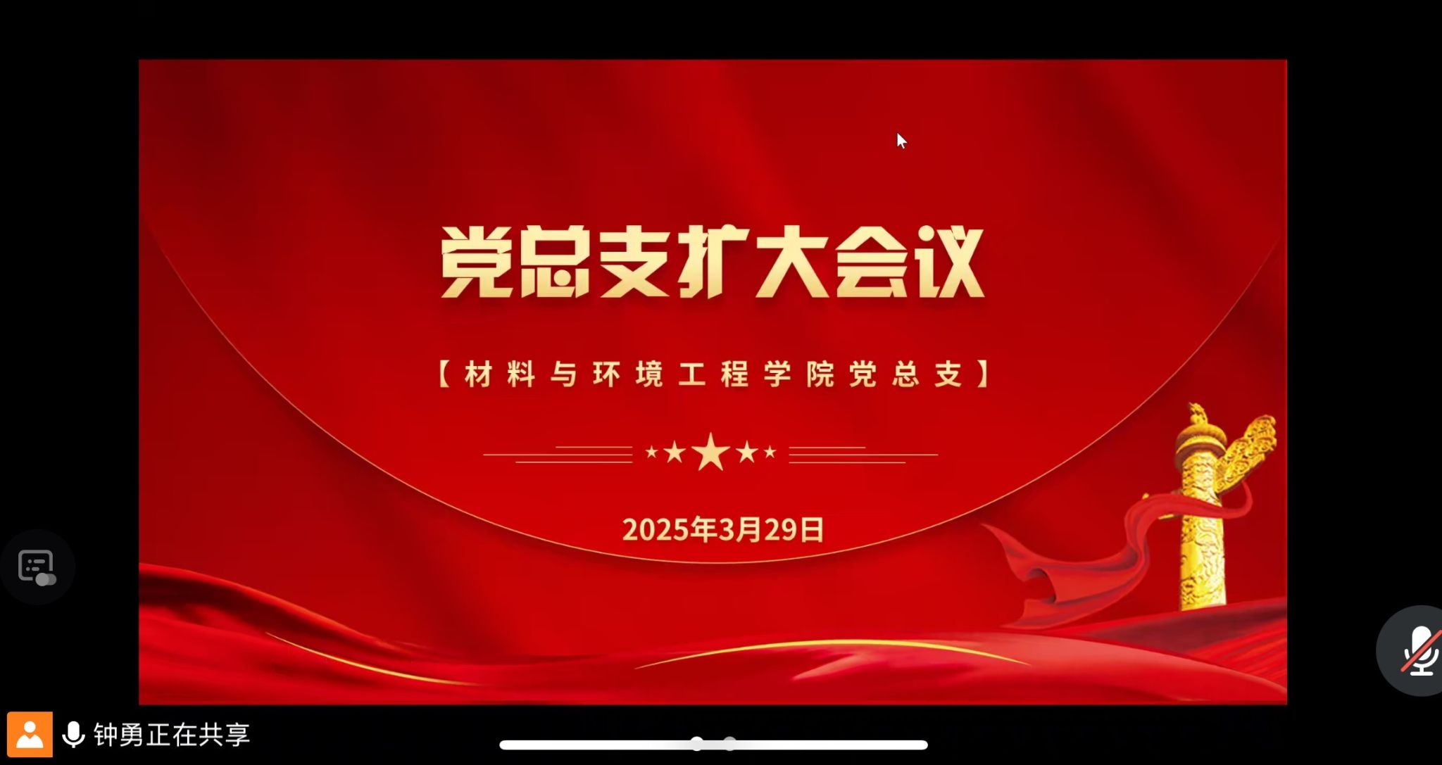 2025 年 3 月 29 日上午 10:00,材料与环境工程学院党总支通过腾讯会议平台召开 2025 年 3 月第 3 次党总支(扩大)会议。会议由党总支书记钟勇主持,全体党总支委员、各党支部书记参加。