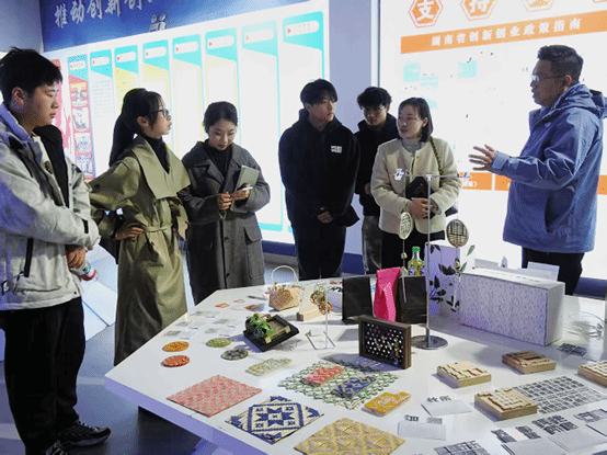 座谈会后,学生们一同前往创业成果展示区参观。展区内,文创手工艺品、创新设计作品琳琅满目,从带有传统编织纹样的实用摆件到兼具艺术感与功能性的创意产品,每一件作品都展现了创业学子的巧思与匠心。