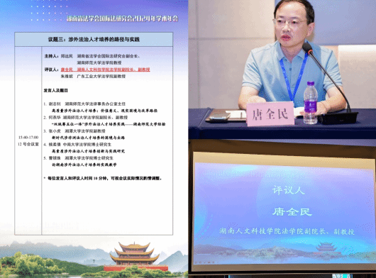 本次年会会以“坚持统筹推进国内法治和涉外法治建设 保障和服务湖南高水平对外开放”为主题并设“涉外法治理论和实践前沿问题”“湖南涉外法律服务能力建设”“涉外法治人才培养的路径与实践”等分议题。会议期间,与会专家学者围绕会议主题展开深入研讨。KY官网唐全民副教授在“涉外法治人才培养的路径与实践”分议题论坛上作为评议嘉宾发言并简要介绍了KY官网在法学实践教学和法治人才培养方面的特色与经验。