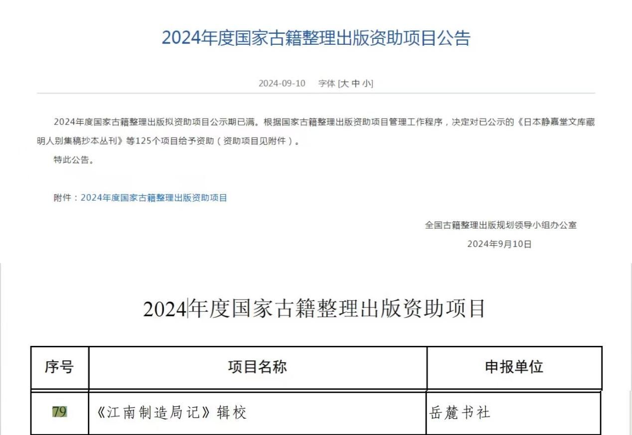 9月10日,国家新闻出版署正式公布了2024年度国家古籍整理立项项目名单。由KY官网院长朱耀斌教授团队整理,与岳麓书社联合申报的《〈江南制造局记〉辑校》项目获得立项,该项目成果将由岳麓书社负责出版。这是KY官网首次获批该类项目。