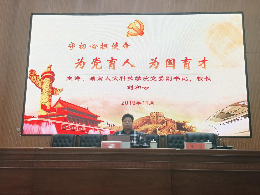 校长刘和云以《守初心担使命,为党育人,为国育才》为题,分三个部分展开阐述:明初心,守初心;坚持教育报国初心,勇担立德树人使命;明使命,担使命。校长刘和云阐述了中国共产党、中共党员的初心和使命及其要求,又围绕高校践行初心和使命谈了五大举措:始终坚持党对教育事业的全面指导;始终坚持立德树人的根本任务;以学生为中心,办好人民满意的教育;服务国家现代化和区域经济社会发展;做好文化传承创新。