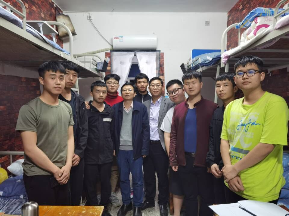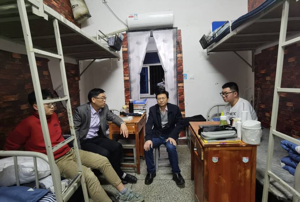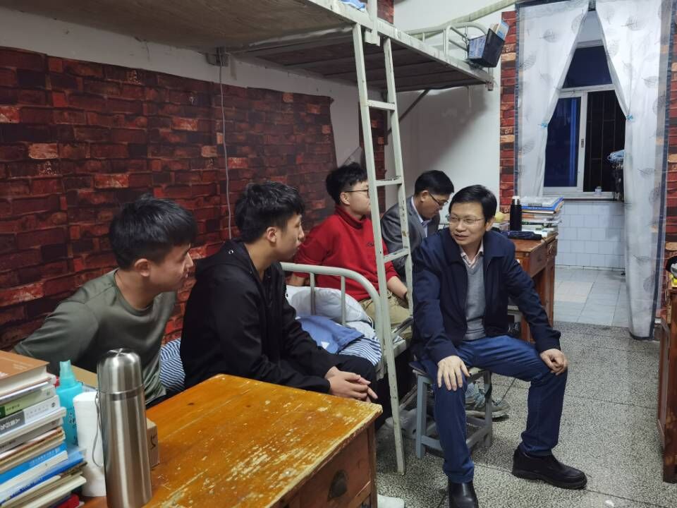 陈志国进入寝室后,同学们热情地打招呼、问好,现场氛围其乐融融。随后陈志国与同学们围坐在一起展开亲切交谈。他一一询问同学们的学习、生活情况,事无巨细。并对从山东远赴娄底求学的同学表示深切关怀,希望他能够适应新的环境,拓展视野,取得新的收获。