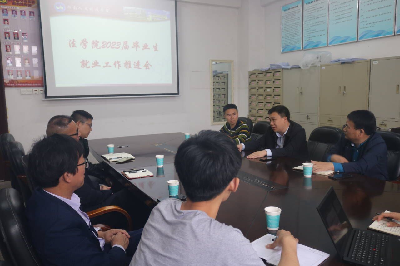 会上,刘景春向曹鑫一行人介绍了法学院今年的就业情况以及考研状况。朱耀斌就毕业生未能及时就业的原因进行总结分析并给出适当建议,他指出学院后续将持续跟进来就业学生的求职进展,确保7月初圆满完成学校安排的任务。肖兵明表示,法学院将继续努力,加强班主任与学生的沟通联系,对未就业的学生提供针对性的就业指导和服务,将就业工作落实落细。最后,曹鑫同与会人员进行交流并做出总结,鼓励法学院毕业生就业率再创新高。