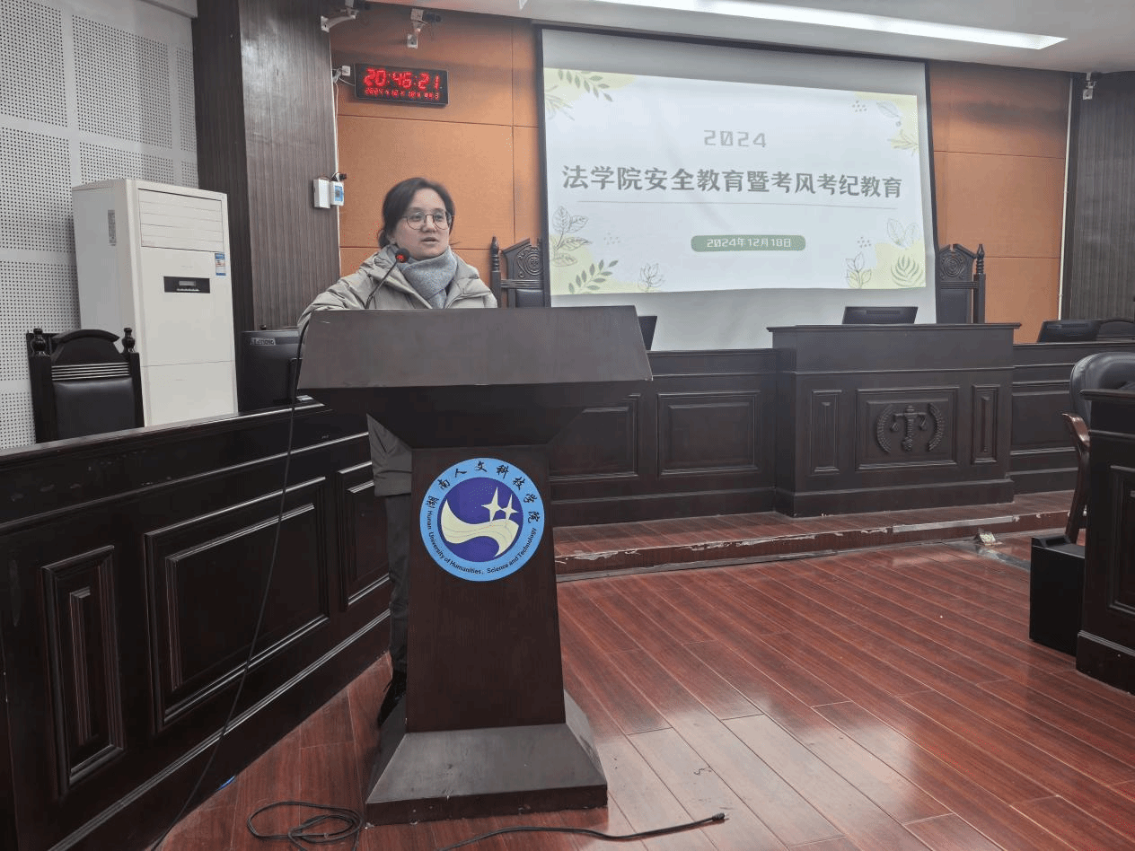 为增强学生的安全意识,确保考试的公平性,弘扬优良校风校纪,法学院于12月18日晚在致远楼202教室成功举办了“安全教育暨考风考纪教育”专题会议。党总支副书记邓南南、学工办主任陈玲、全体辅导员、团学会主席团成员以及各班级主要班委和寝室长参加了本次会议。
