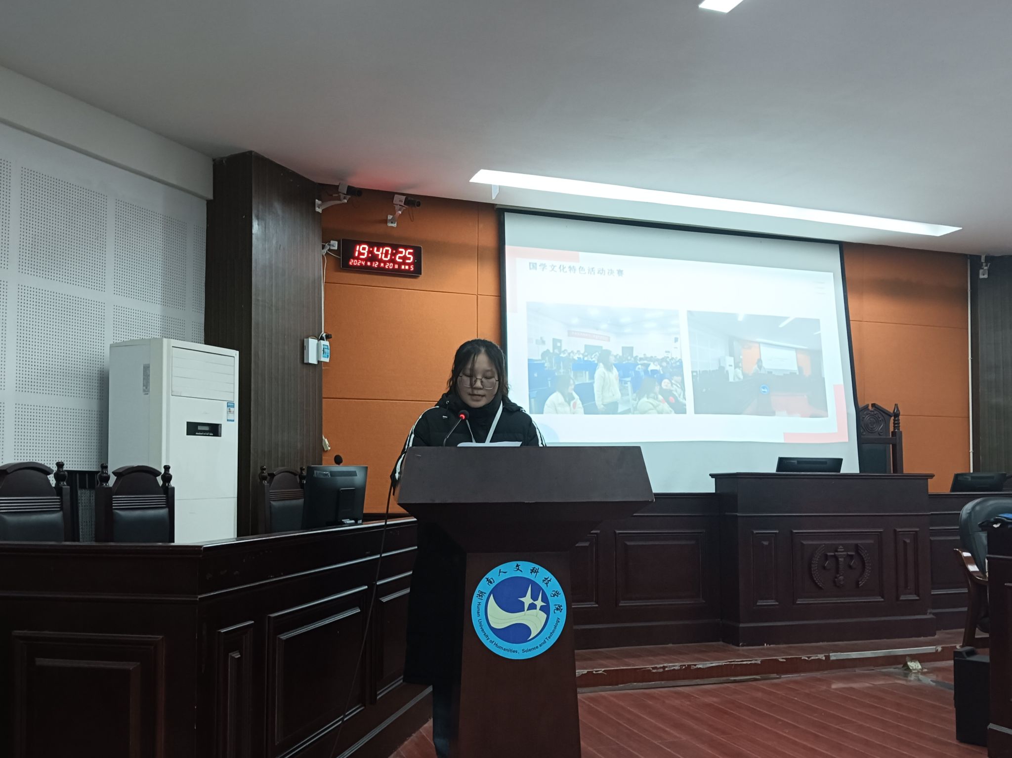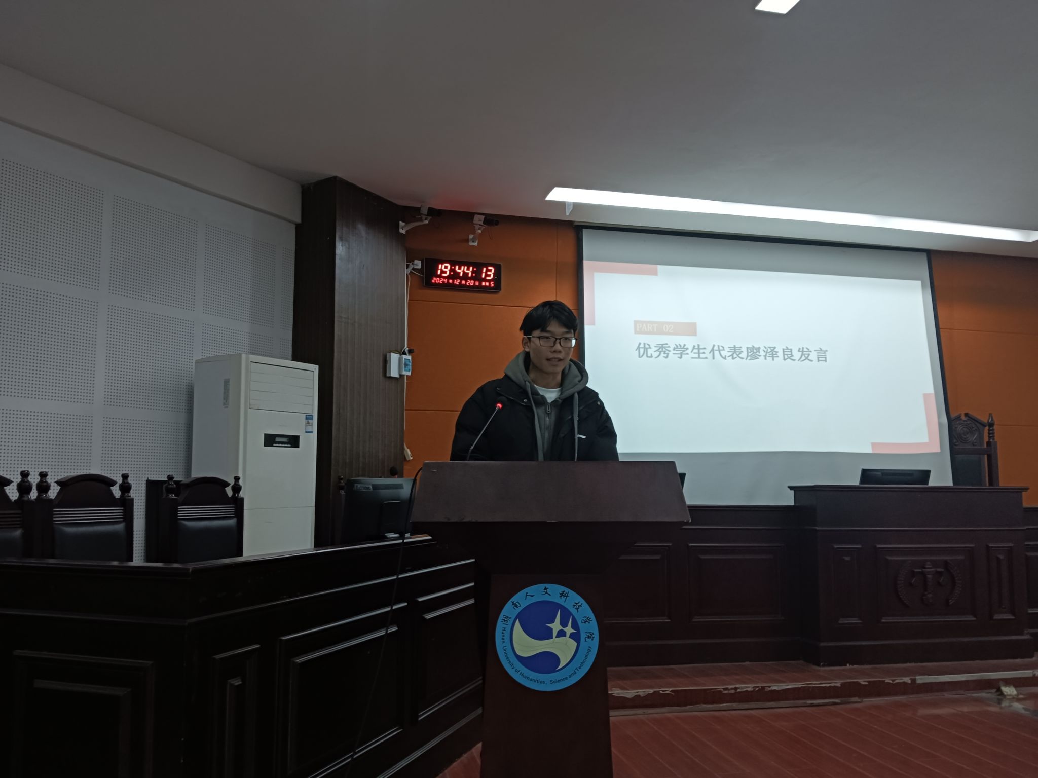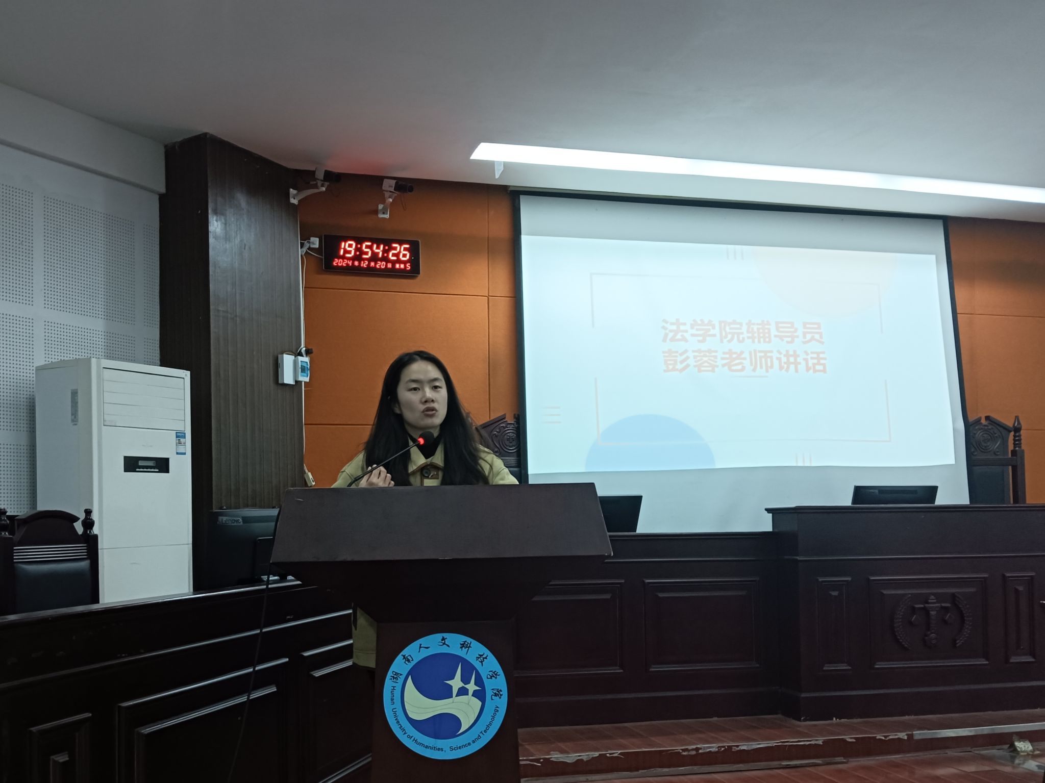 12月20日晚,法学院在致远楼202教室隆重召开学风建设总结大会,主题为“携手共筑良好学风,助力学生全面发展”。出席本次大会的有学工办主任陈玲、辅导员羊哲思、彭蓉,团学会干部以及2024级部分学生代表。