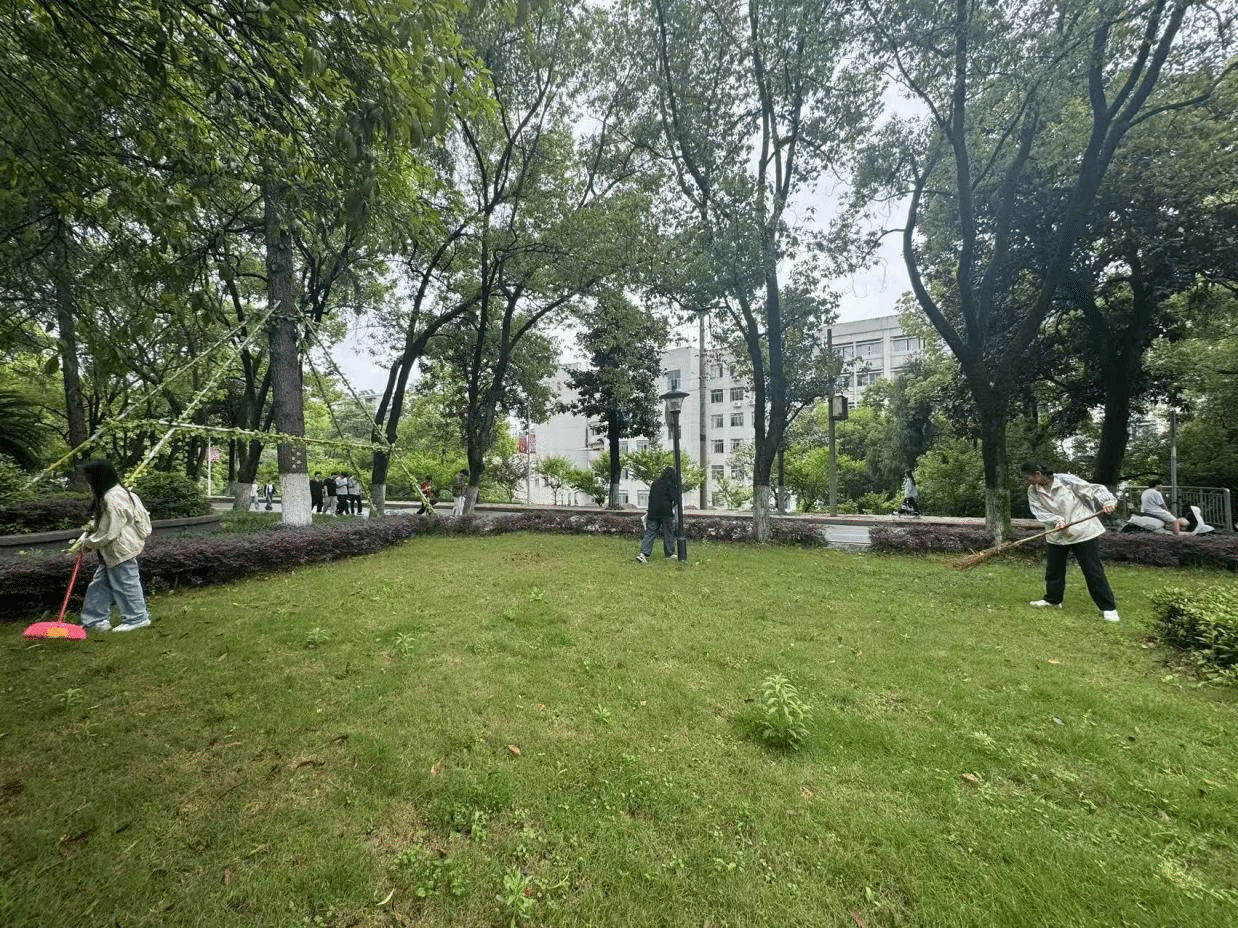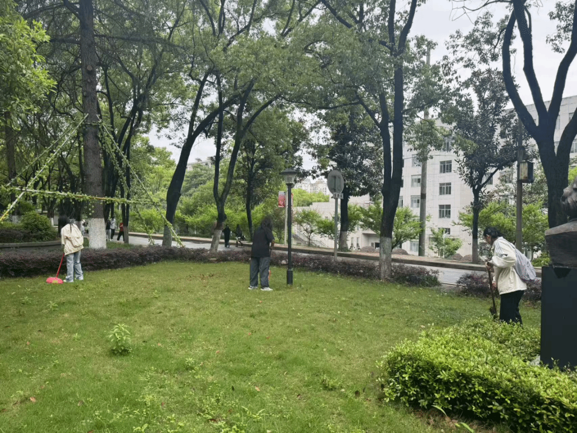 当四月的风裹挟着雨后的湿气漫过校园,4月17日下午,法学院24级社工二班的同学们已在若谷楼旁的花坪区域开始了今天的打扫。