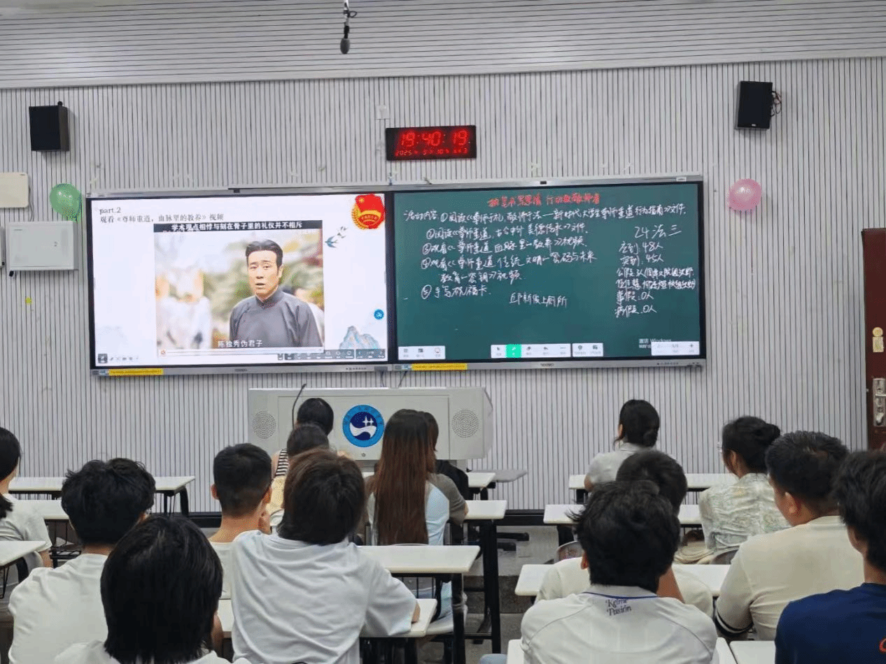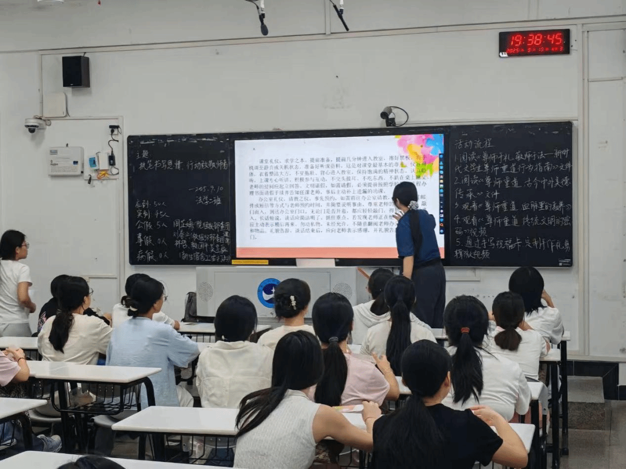 此次团课采用线上、线下相结合的方式。首先,同学们阅读了《新时代大学生尊师重道行为指南》,学会如何将尊师意识转化为得体的行为习惯;随后,通过尊师重道系列视频学习,让同学们树立了崇德向善的风向标,奠基了立身处世的品德根基。最后一环节,各班组织同学们手写祝福卡、剪辑微视频,用多元化形式传递感恩之情,让感恩教育不再是抽象的说教,而是可感、可触的温暖体验。