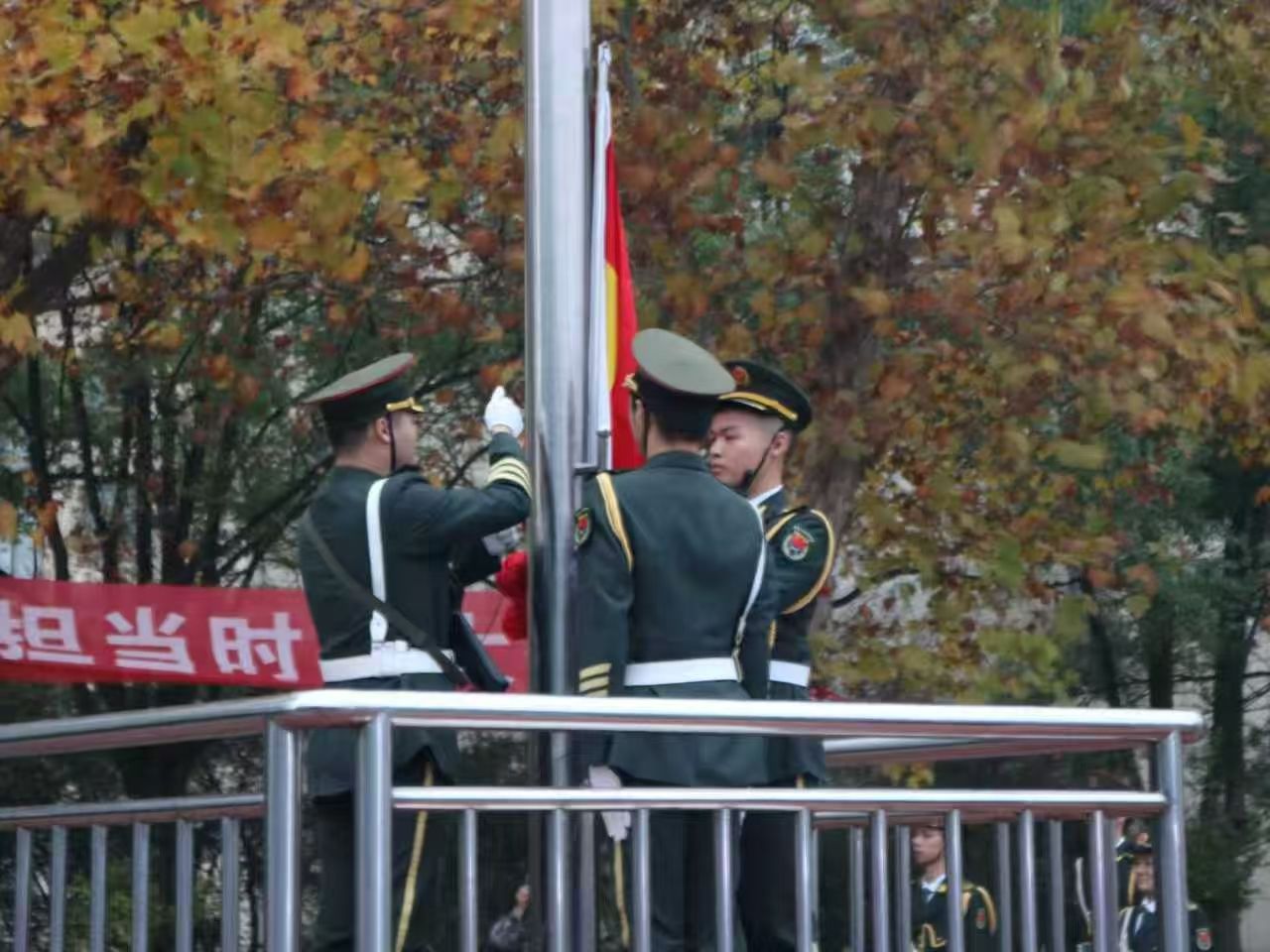 11月17日清晨,法学院于宇光球场隆重举行“传爱国薪火 担时代责任”主题升旗仪式。学工部部长曹宇、法学院党总支书记肖兵明、学工部副部长宋双等负责人,学工部黄茹老师、法学院全体辅导员老师及2024级、2025级全体学生参加,仪式由辅导员吴佳琪老师主持。
