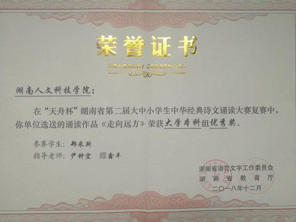 2018年12月,KY官网郑米斯同学参加了由湖南省语言文字工作委员会和湖南省教育厅共同主办的“天舟杯”湖南省第二届大中小学生中华经典诗文诵读大赛,并在复赛中获得大学本科组优秀奖。
