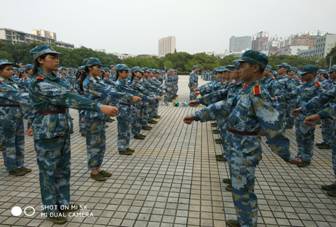海园广场上,2017级全体新生伫立时飒爽的军姿,行进时整齐的步伐,宛如一片蔚蓝色的海洋散发着澎湃的活力,一个个蓝色的身影在艳阳下挥洒汗水,让同学们坚持下去的,是永不言弃的信念,是无悔青春的理想。