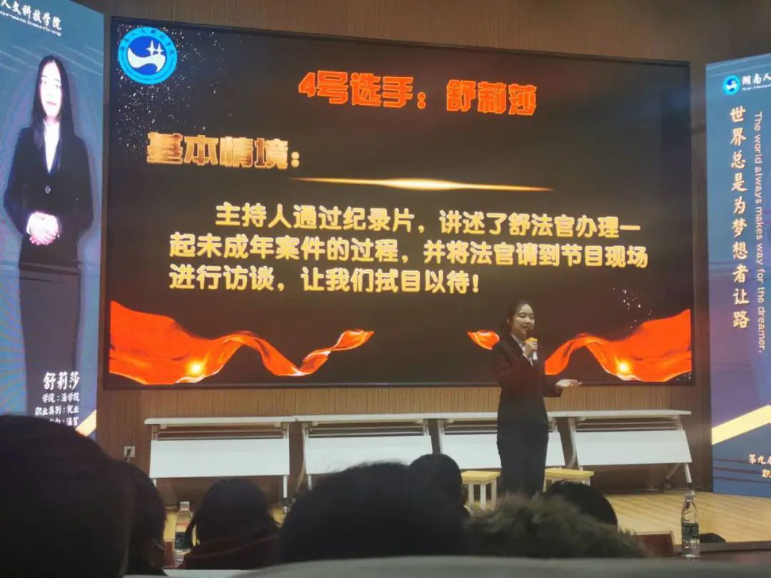 “世界总是为梦想者让路。”这是舒莉莎的参赛宣言。第一环节的职业生涯规划演讲展示,舒莉莎从自我认知、职业认识、目标路径、职业评估等方面进行展开,从容不迫、娓娓道来地向大家讲述,给评委和观众留下了深刻的印象。在第二环节的情景模拟中,舒莉莎选手用新颖的方式,通过模拟法制在线节目,展示了处理一起未成年伤害案件的过程,并模拟受邀嘉宾的身份,分享自己对未来职业的看法,表述了自己的志向——要做一名有温度的法官。