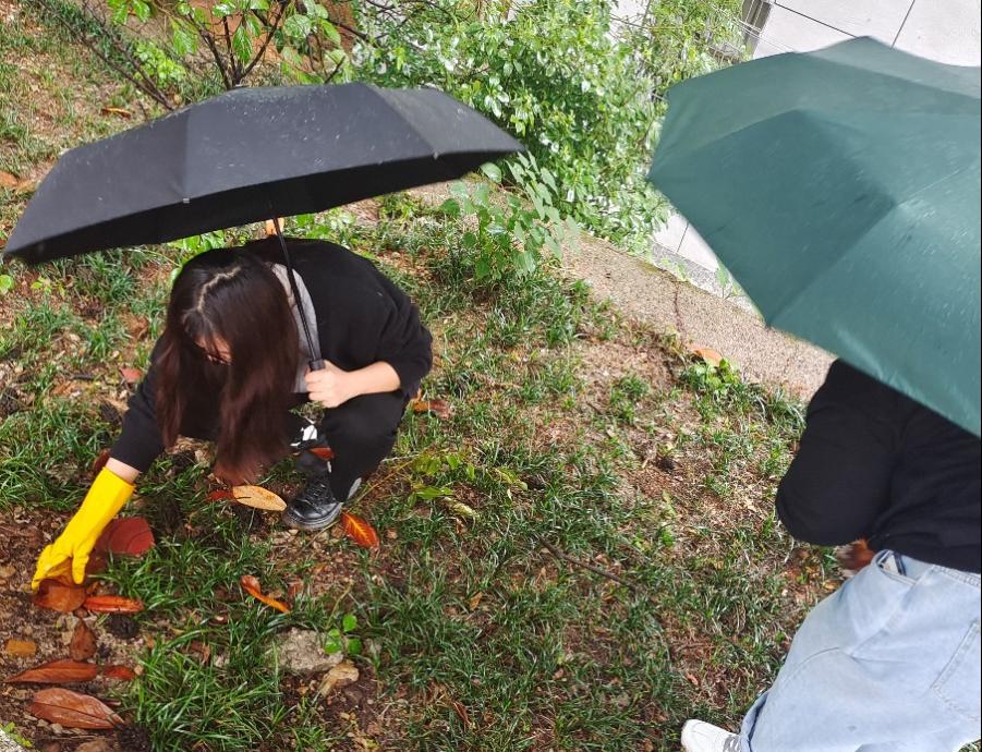 活动在下午一点准时展开,同学们准时到达了指定地点。组员们根据组长李杜的安排,拿好自己的清理工具开始打扫。天空下着小雨,但同学们依旧坚持完成任务,她们或用铁夹,或用双手将枯叶捡起。在同学们一丝不苟的工作下,这片花田重新焕发生机。