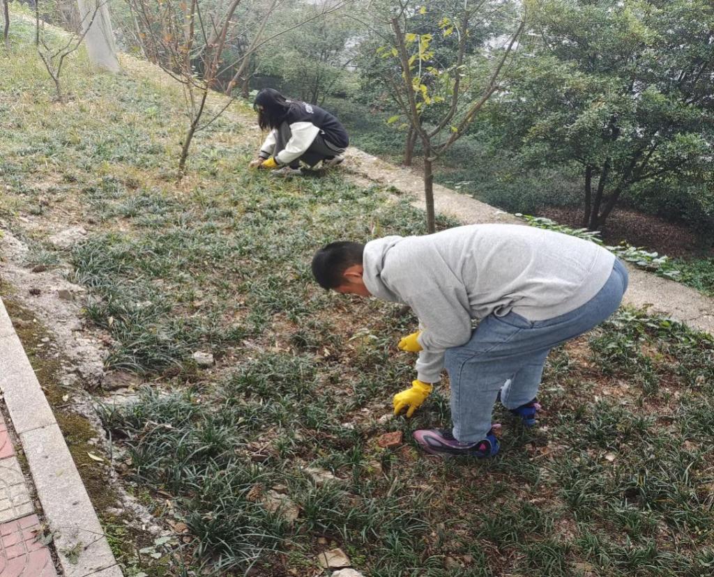 四名成员按时在指定区域集结,开始相关工作。组员们有的用扫帚扫落叶,有的用手拔野草,有的用车装垃圾……经过一段时间的共同努力,卫生区域的地上没有了落叶,花圃里没有了杂草,打扫过的花田在冬季里焕发青春。最后,组长组织大家整理好卫生工具,离开整洁焕新的花圃,本次任务圆满结束。