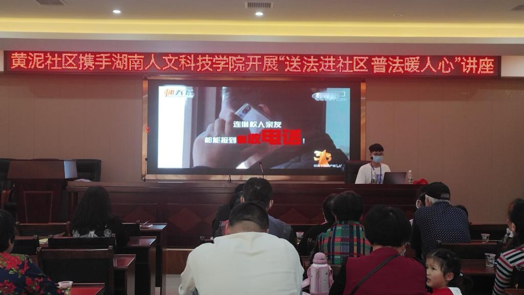 3月13日上午,辅导员宋元烨和志愿者们前往黄泥社区,进行集合分组后由各组负责人带领前往目的地。志愿者们分发普法宣传单,宣传相关普法知识。下午,青年志愿者邹宏宇作为普法讲座主讲人,为黄泥社区居民进行普法讲座的宣讲,旨在使居民们增强法律意识,知法守法,用法律维护自身权益。