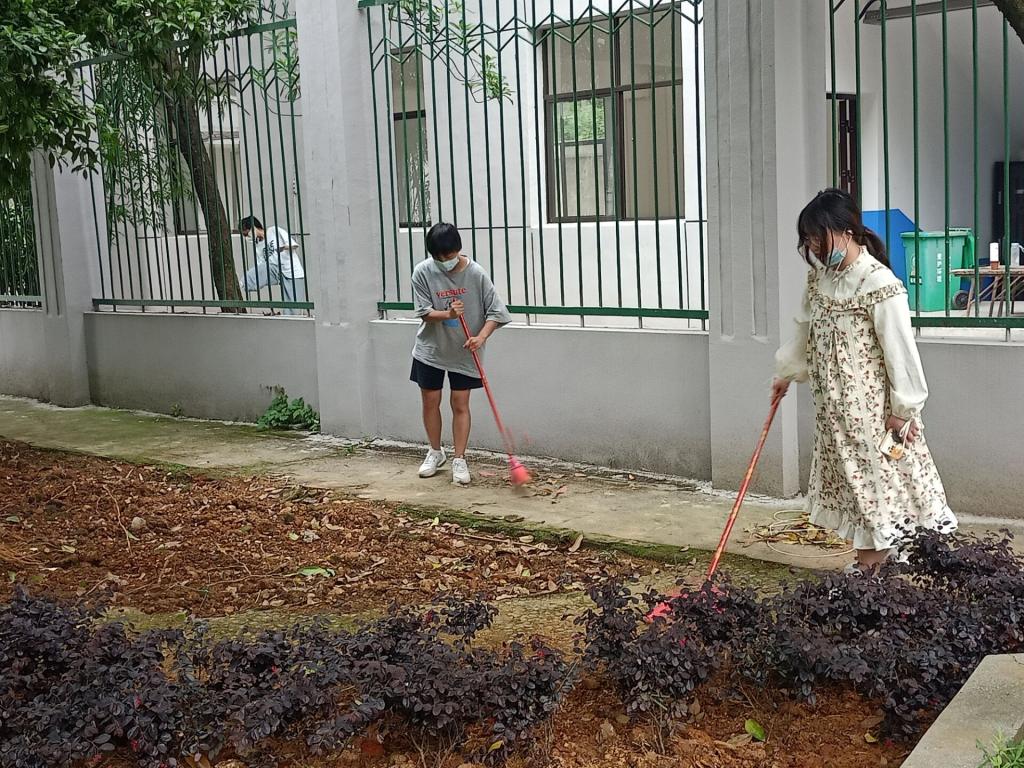 面对花坛里随处可见的枯枝败叶、隐秘细小的塑料纸和冗长乱生的杂草,同学们拿着扫帚和铲子,弯下腰,低着头认认真真的清扫着每一片被风吹落的树叶,分工明确、一丝不苟的将垃圾清理干净。雨后的空气散发着淡淡的湿气,同学们一脚深一脚浅地踩在湿滑的泥里,厚重的泥土减缓了同学们行动的速度,但同学们仍以饱满的热情完成了工作。
