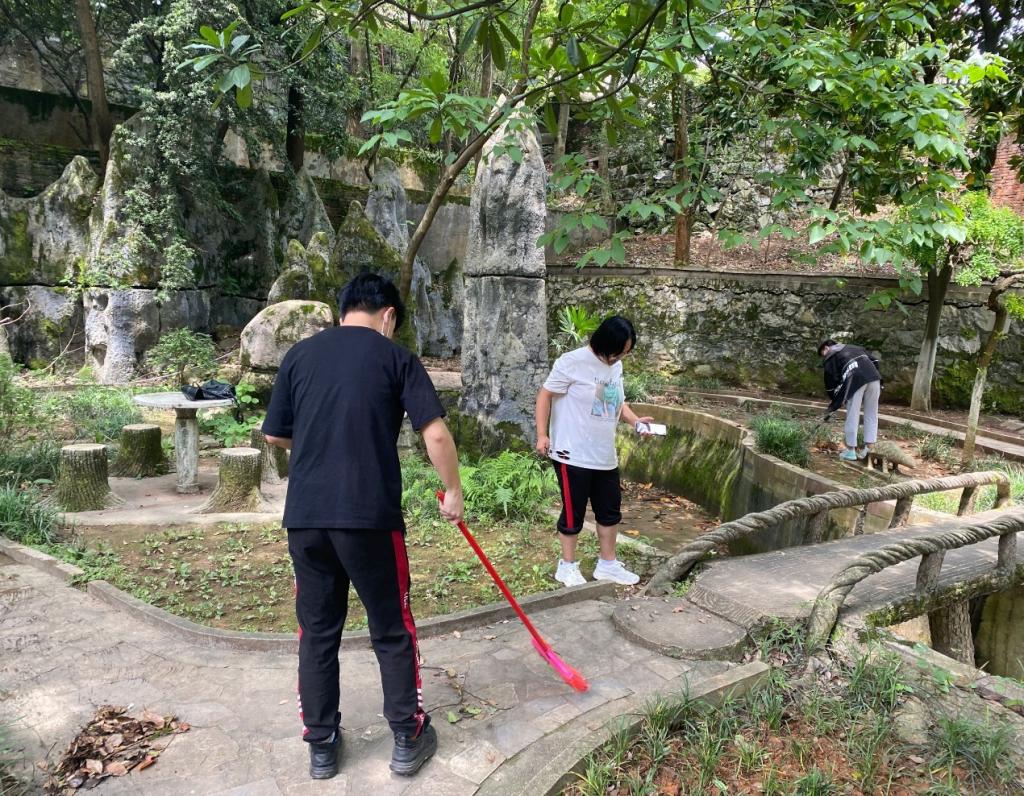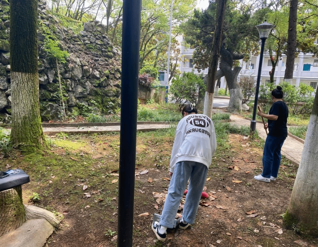 同学们拿好工具后迅速到达花坛,随后奔向各自的负责区域,开展各自的劳动:一部分同学挥动着扫帚清扫过道,一部分同学使用耙子弯腰清理每一寸土地,其余同学戴着手套,捡拾花田里难以去除的垃圾,不放过任何角落。最终在同学们半个多小时的“战斗”下,整片花田不留任何垃圾,成为人文校园中一道靓丽的风景线。