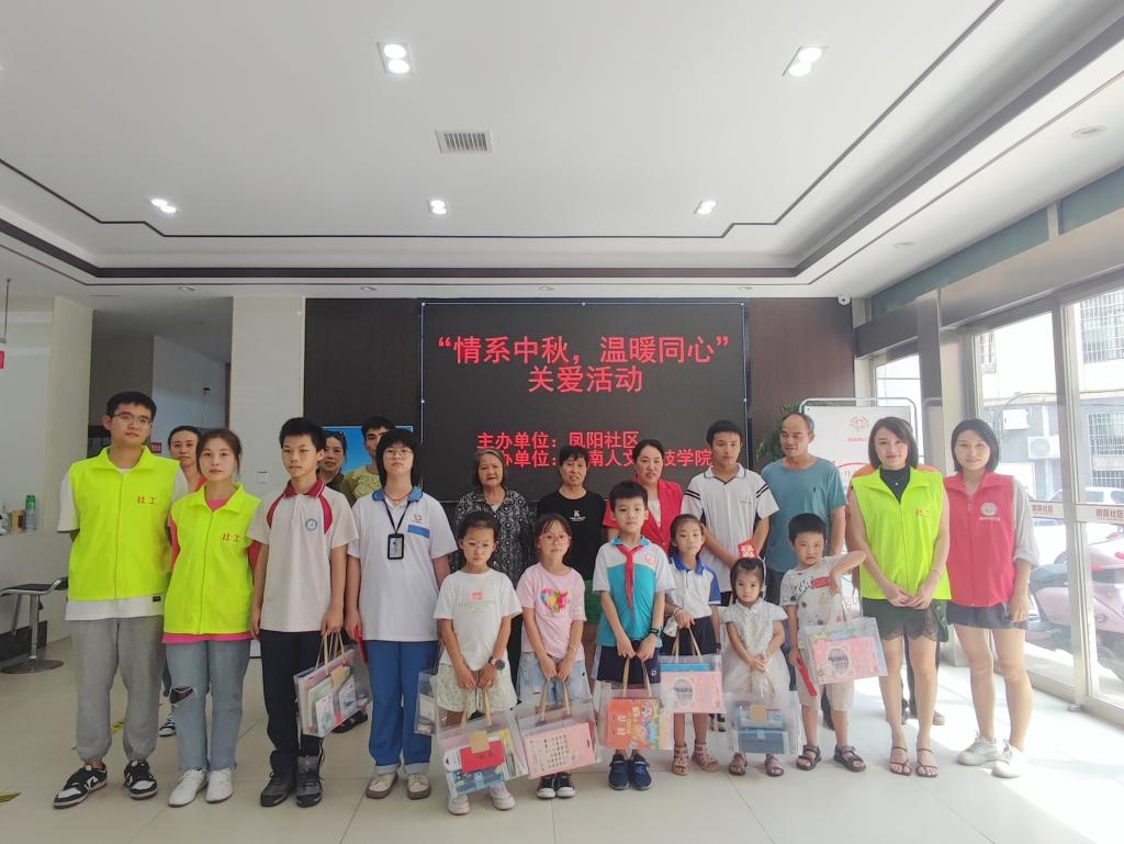 9月9日,在中秋佳节即将来临之际,法学院刘惠婷老师带领社工团队协助凤阳社区开展“情系中秋,温暖同心”关爱活动,为凤阳社区贫困优秀学生送去关爱与祝福。 社工团队依次向孩子们发放慰问金与精心挑选的文具礼盒,主动与孩子们沟通、交流,鼓励他们好好学习、健康成长,在奋斗中成就梦想。 此次关爱活动,社工团队不仅为孩子们送去了物质上的关怀,更给予了精神上的慰籍和鼓励,唱响了人文关怀的主旋律。