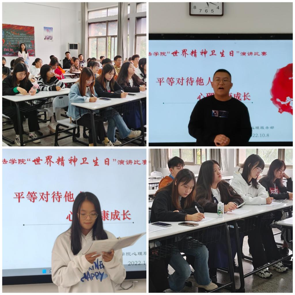 10月9日晚,在心理服务部的组织下,法学院22级各班开展了“10.10世界精神卫生日”的心理健康主题班会活动。在10月10日的演讲比赛总决赛中,心理服务部邀请到学工办主任陈玲和法学院辅导员袁嘉炜以及主席团担任评委。晋级决赛的十名选手都精神饱满,信心十足。最终胡姝同学获得一等奖,靳明桦、程威军同学获得二等奖,刘雯婧、肖娜珍、张智博同学获得三等奖,张浩楠、徐丹、卢思思、罗文静同学获得优胜奖。