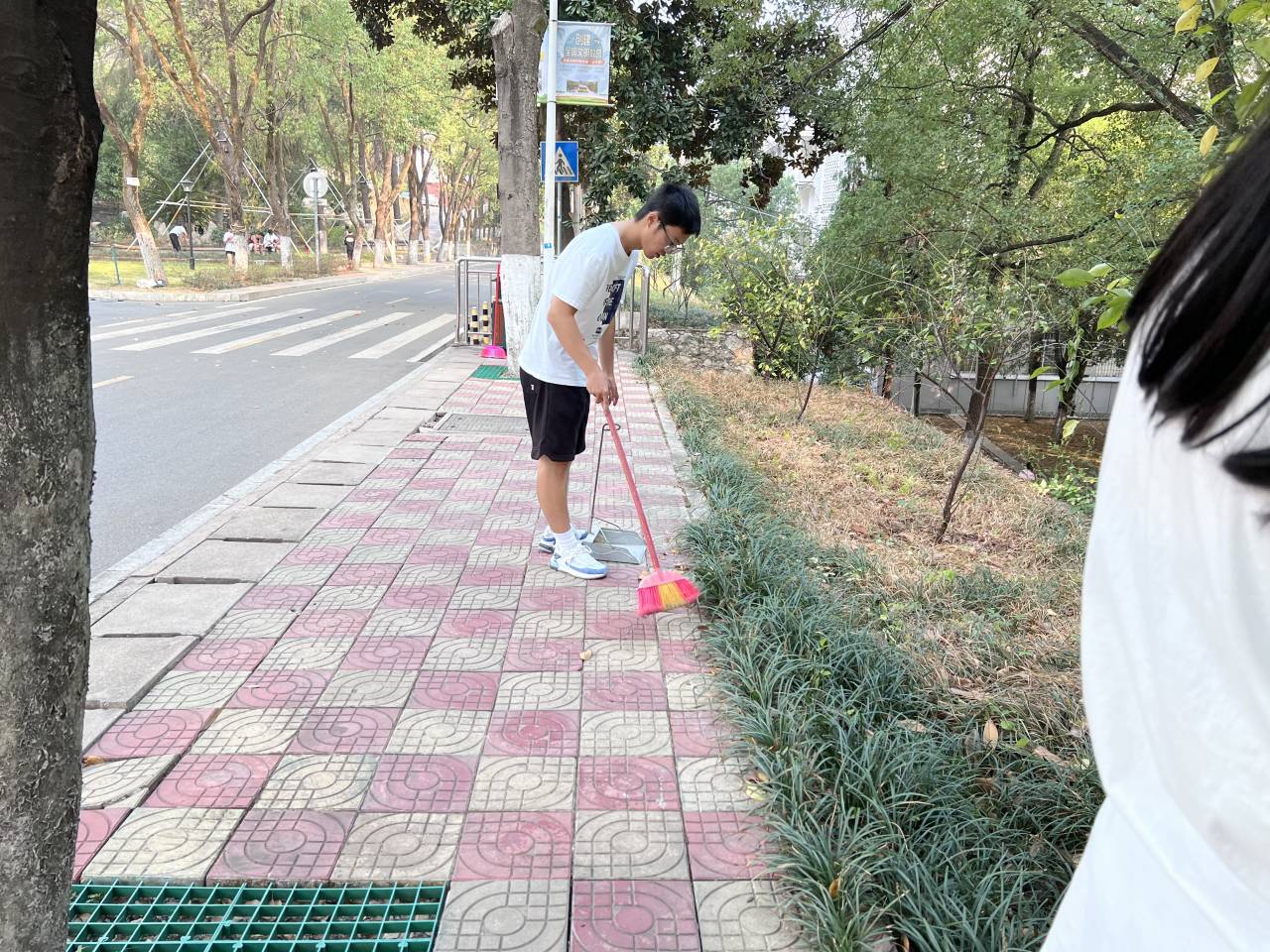 近日阴雨绵绵,落叶堆积在潮湿地面上,给此次劳动带来了不少困难,但同学们早已准备充裕,不畏艰难,积极地开展本次劳动:同学们分散在马路各处,有的同学手拿扫帚和耙子,弯着腰把雨水里的垃圾与落叶清理出来,并一遍遍细致的检查,不放过任何一片落叶;有的同学戴着手套,前往花坛的角落之处,用手去捡拾难以发现的垃圾。在同学们的共同努力下,马路变得干干净净,路旁的绿化带也重新焕发了昔日的容颜。
