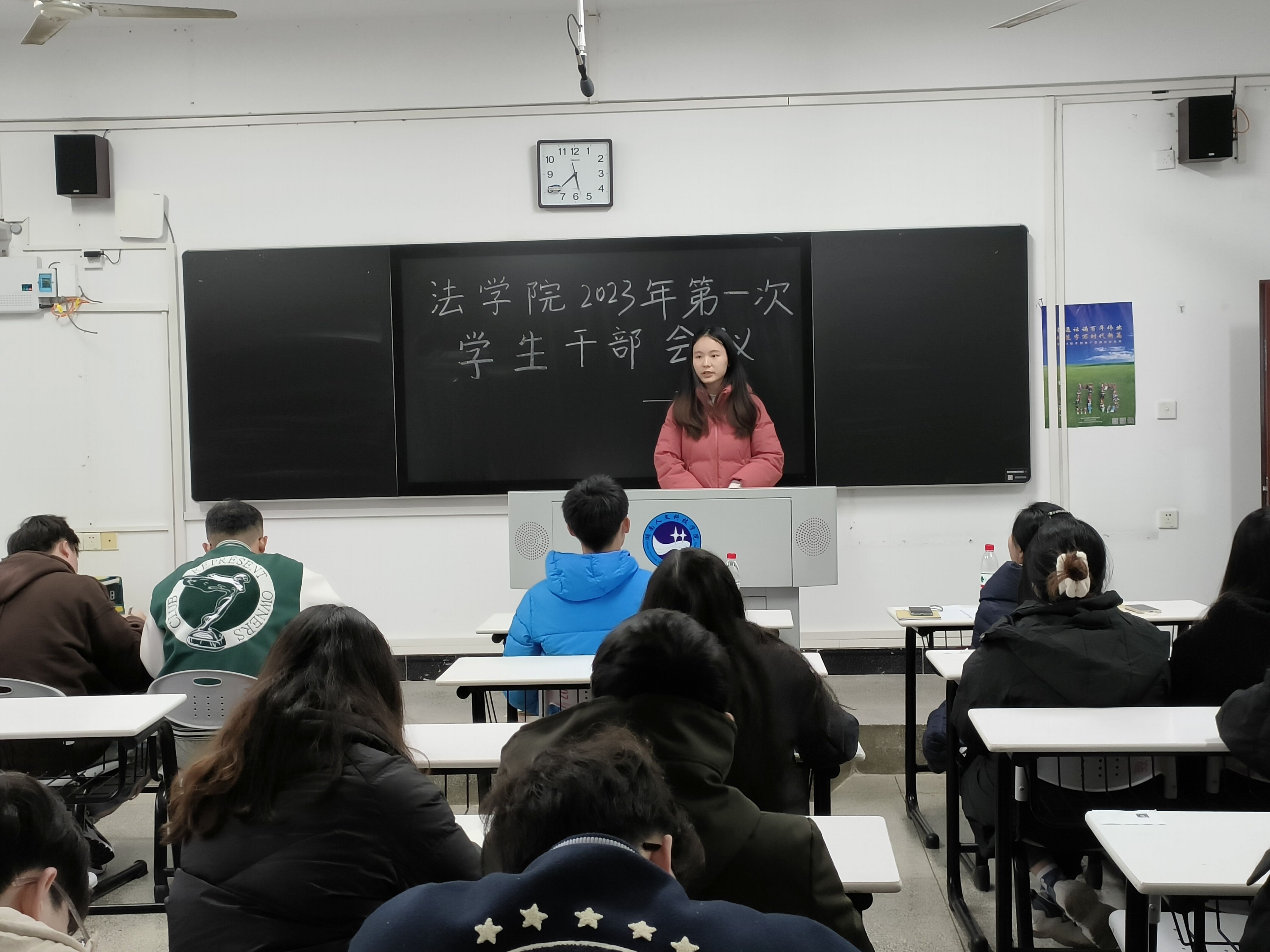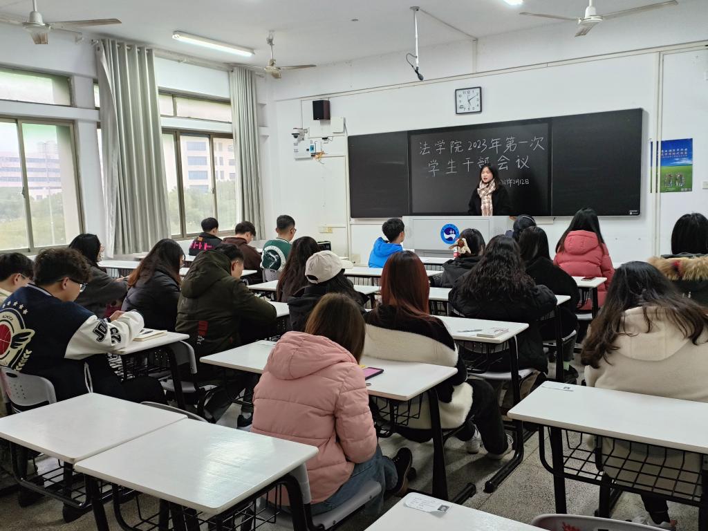 为了更好地开展新学期工作,2月12日,法学院在致远楼303教室召开学生干部会议。学工办主任陈玲,辅导员袁嘉炜、羊哲思,团总支与学生会主席团成员及各部门部长参会。