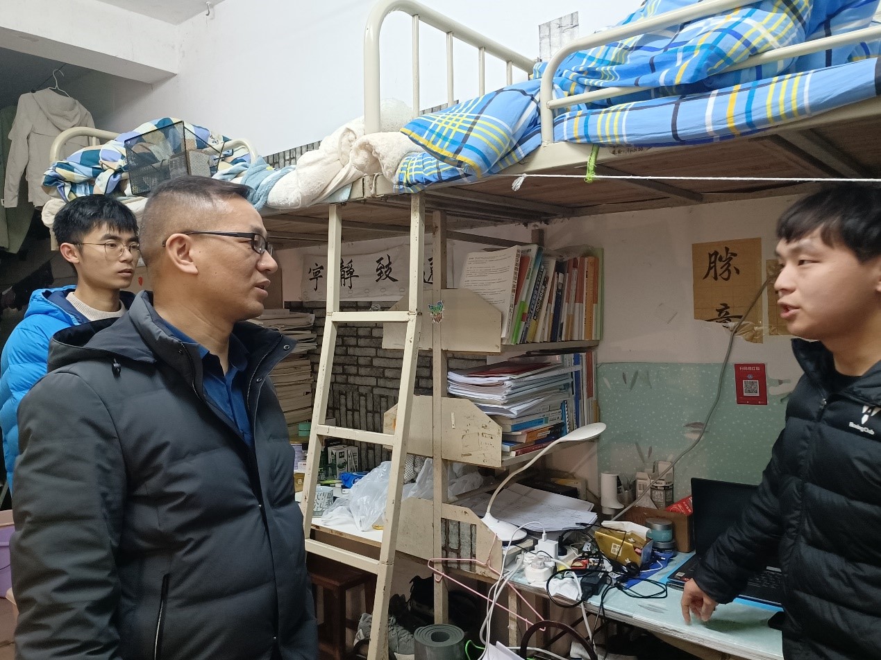 下寝过程中,老师们细心询问学生近况,学生积极配合,不仅呈现了干净整齐的宿舍环境,而且展现了和谐快乐的宿舍氛围。老师们嘱咐学生在春季流行性感冒高发期,要多注意个人卫生及保暖,保持寝室日常通风,养成良好的生活习惯。刘景春以宿舍安全为重点,根据检查过程中发现的问题做出相应指导。肖兵明以就业方面为重点给学生作指导,强调要树立正确就业观和提升个人能力,同时也要及时关注不同地区就业政策。