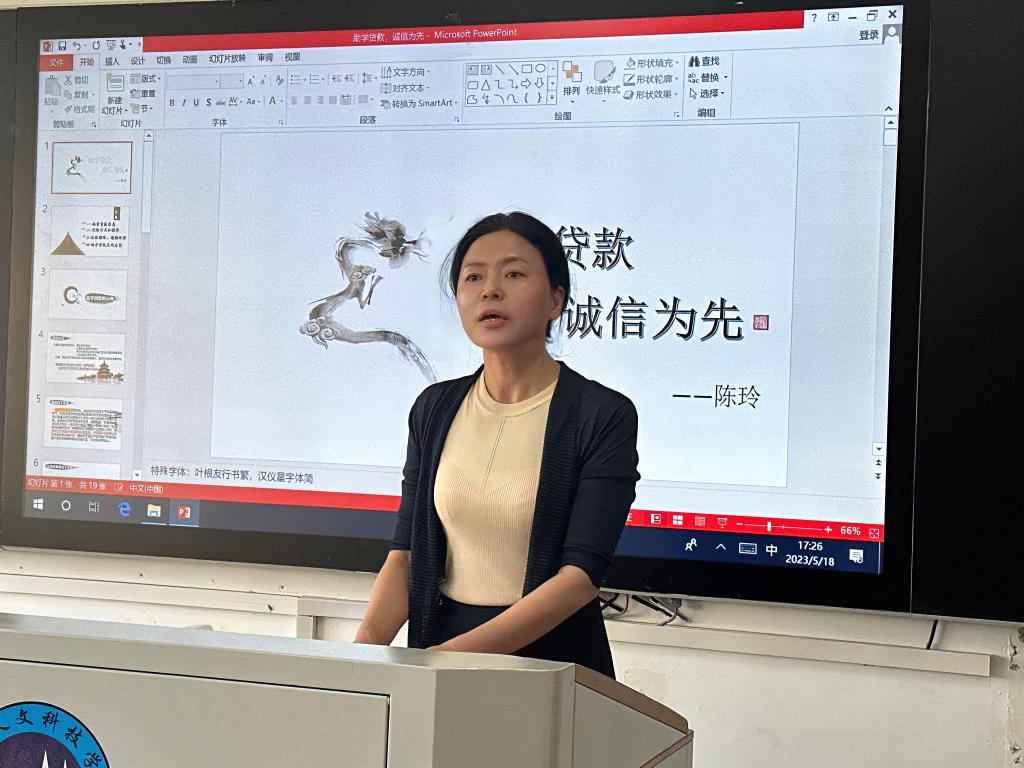 陈玲向大家讲解了助学贷款分类、还款方式和操作、还款期限、逾期处理和违约后果。她告诫毕业生要诚信还贷,远离失信。她指出:每个人都必须建立良好的个人信誉。如果出现特殊情况无法还款时,一定要按照还款流程申请延迟还款。