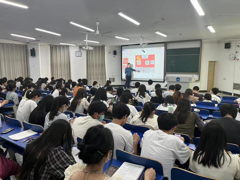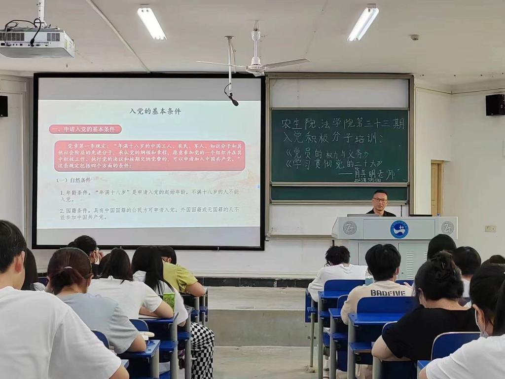 5月21日,法学院党总支书记肖兵明以《学习贯彻党的二十大》为主题,带领学员们深度学习二十大的内涵与精神,接着他又以《党员的权利和义务》为重点,向学员们讲述了成为党员的条件与要求以及党员的义务与权利。他强调,要辩证统一地认识党员的义务与权利,自觉承担义务,积极行使权利,希望学员们都能为实现中国百年奋斗目标而奋斗。