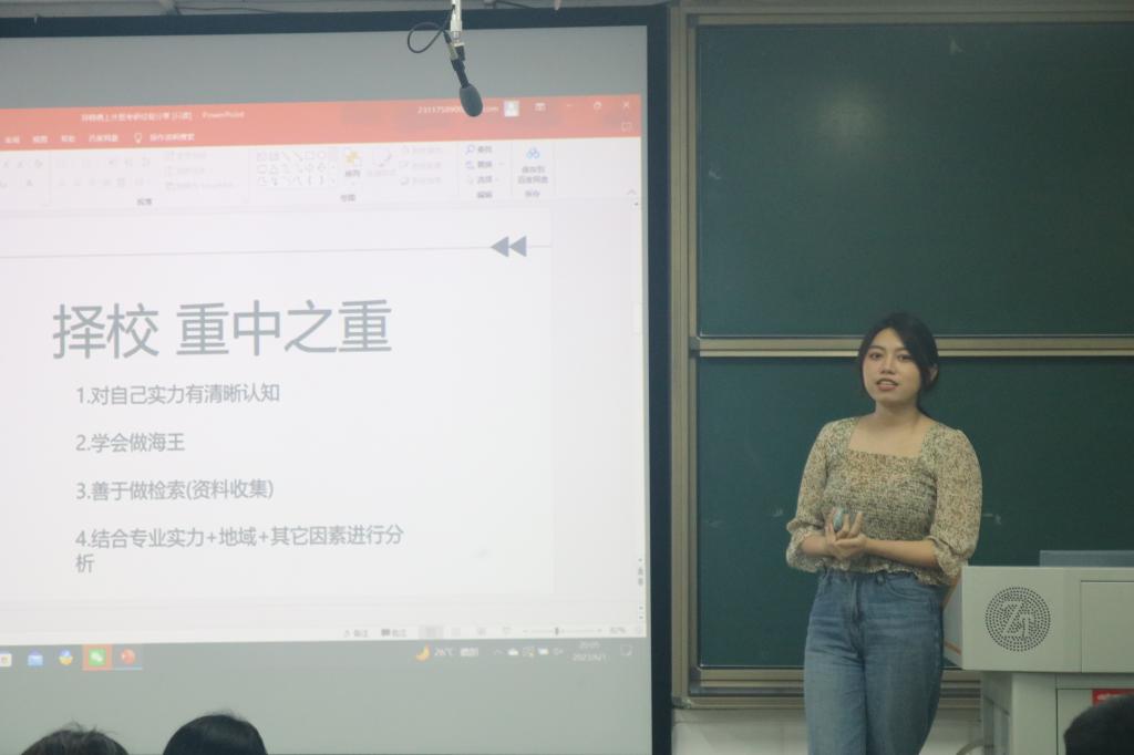 会上,陈玲首先对于考研学生如何择校以及怎样了解所选院校的相关信息进行了讲解。接着由7位优秀毕业生们分别上台进行经验分享。他们详细地讲述了自身的学习方法和计划安排,强调要合理安排时间。同时也要注重身体健康方面和心态保持方面,做到坚持锻炼,学会排遣压力,与家人老师沟通。最后,刘景春就会议进行总结。他提出同学们要合理吸取学长学姐们的经验教训,以积极的心态备战考研、法考,并期待同学们能取得满意的成绩。