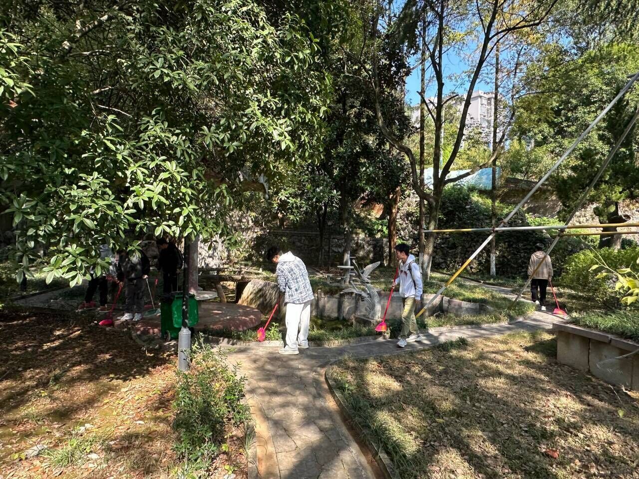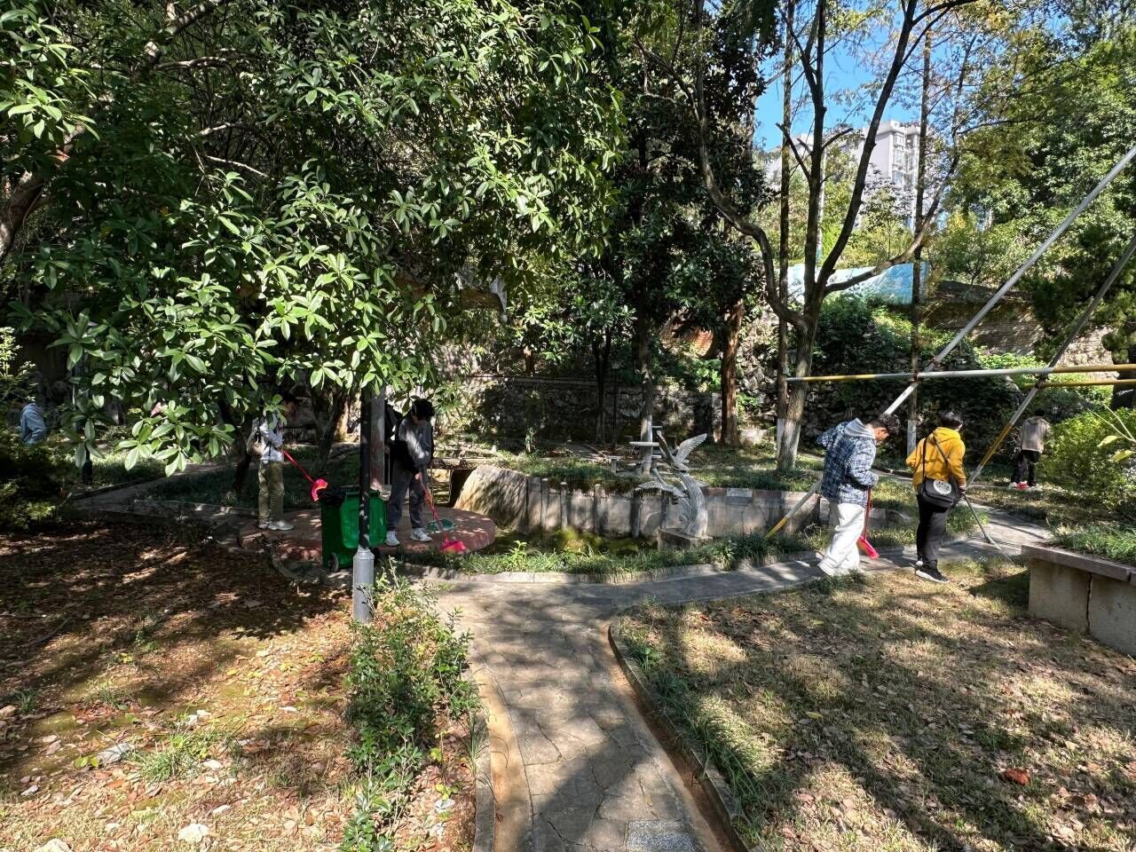 立冬已过,天气降温,但同学们对劳动的积极性不减,不停在花田里打扫着。同学们奉行着互帮互助的原则,清理着林荫小道上的落叶以及花坛里面的零星垃圾,并在最后将垃圾汇集倒入垃圾桶,完美完成了本次清扫任务。