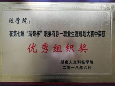 法学院在近两个月来的比赛进程中组织了大量的学生参赛,老师积极指导,法学院书记尹钟宏在比赛前对选手进行了指导,在比赛时担任了评委,并对比赛多了精彩的点评,被授予第七届“瑞奇杯”职要有你——职业生涯规划大赛优秀组织奖。(撰稿:尹钟宏)