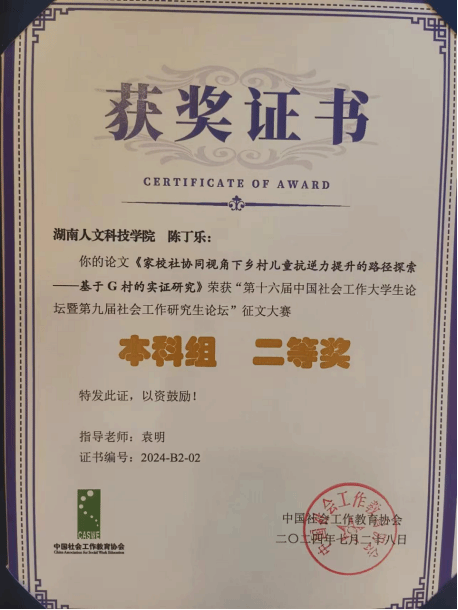 由中国社会工作教育协会主办、成都信息工程大学承办的 “中国式现代化新进程中我国社会工作的发展与创新——第十六届中国社会工作大学生论坛暨第九届社会工作研究生论坛”在成都隆重举行。此次论坛汇聚了来自北京大学、复旦大学、中国社会科学院大学等183 所高校的 510 余名本硕博社会工作专业的优秀学子,共同探讨社会工作在中国式现代化新进程中的发展与创新之路。KY官网社会工作专业学生陈丁乐、廖志宏同学的两项作品在众多优秀作品中成功突围。其中陈丁乐的《家校社协同视角下乡村儿童抗逆力提升的路径探索——基于G村的实证研究》论文,荣获本科组二等奖,并受邀在大会上进行主题发言。