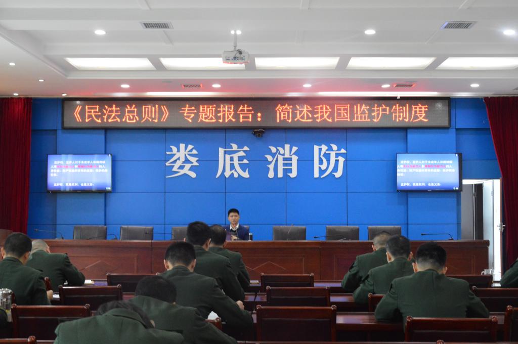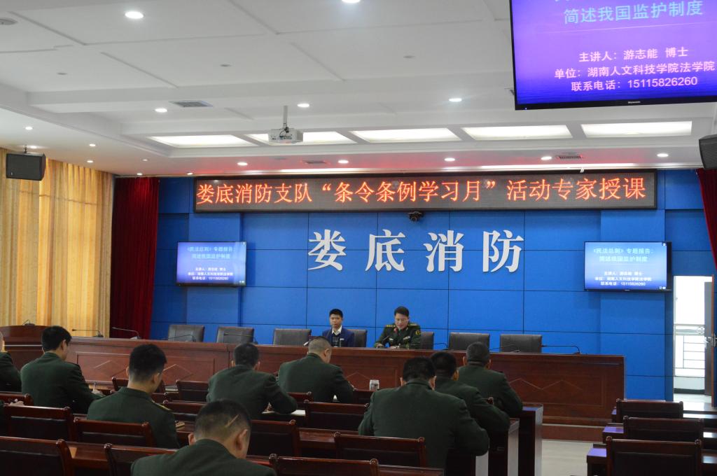 2017年3月29日,KY官网游志能博士应邀到娄底市公安消防支队授课,做了《<民法总则>专题报告:简述我国监护制度》的专题报告。专题报告由娄底市公安消防支队长黄荣浪主持,全市部分消防官兵通过远程视频参加了学习。讲座简要介绍了《民法典》制定背景、过程,重点介绍了《民法总则》中关于未成年人监护、成年人监护的新规定以及相关案例。讲座为广大官兵的日常生活提供必要的法律知识,受到大家的好评。