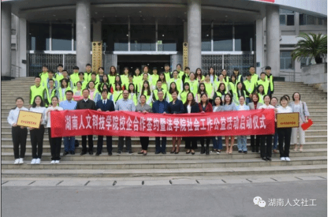 2017 年开办社会工作专业以来,法学院积极与娄底市民政局、司法局、市委组织部和社会工作机构与全国协会对接,共同探索人才培养模式。社会工作专业教研室立足本地实际,积极拓展交流空间,聘请长沙暖心社工、深圳彩虹社工、娄底大同社工机构等相关专业人员走入课堂,培养社工实务人才。社工教研室支持课堂教学模式改革,大力推进社工实务与仿真教学探索。2019 年 9—10 月,法学院与娄底市社会福利院、泓和康复医院和娄底超群社工服务中心协同打造社会公益服务品牌。这种校地合作方式贴近社会生活与工作实际,把学生的理论学习、专业伦理与专业实务有机结合起来,促进大学生专业知识、实务能力、综合素质和思想品格的同步提升。
