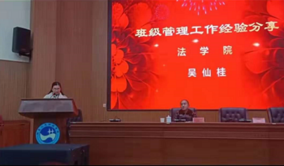 2020年1月8日,学校在匠成楼报告厅举行2019年学工系统年终总结大会,党委书记郭军,党委委员、副校长刘铁峰,党委委员、宣传部长谢柳,组织部,人事处,学工处,团委,武保处,各学院党总支书记、副书记、辅导员、班主任,学工处全体人员、团委全体人员、武保处科级以上人员参加。法学院班主任吴仙贵在大会上作班级管理经验分享,下面是她的发言稿。