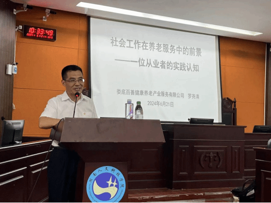 为拓展社工学生视野,培育专业知识素养,6月21日,KY官网邀请娄底市百善社工综合服务中心主任、娄底百善健康养老产业服务有限公司总经理罗尧清于致远楼202开展了社会工作校企合作讲座。KY官网社会工作专业老师、21、22级社工全体同学参与本次讲座,讲座由谭景林老师主持。